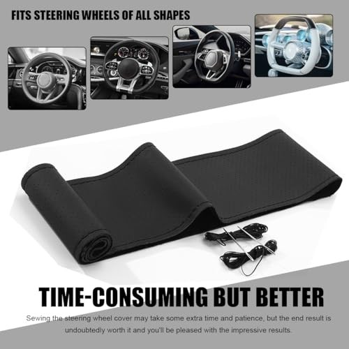 Genuine Leather Steering Wheel Cover, Stitch on Wrap, DIY Full Hole Black
