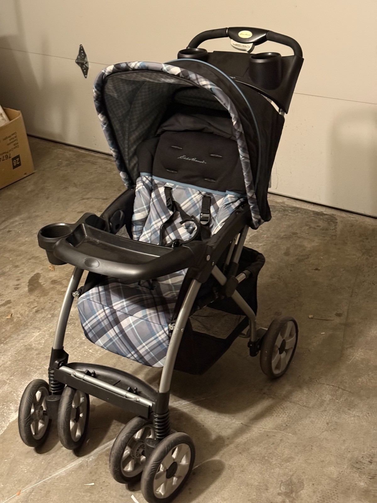 Eddie Bauer Single Toddler Stroller featuring a classic blue and gray plaid tar