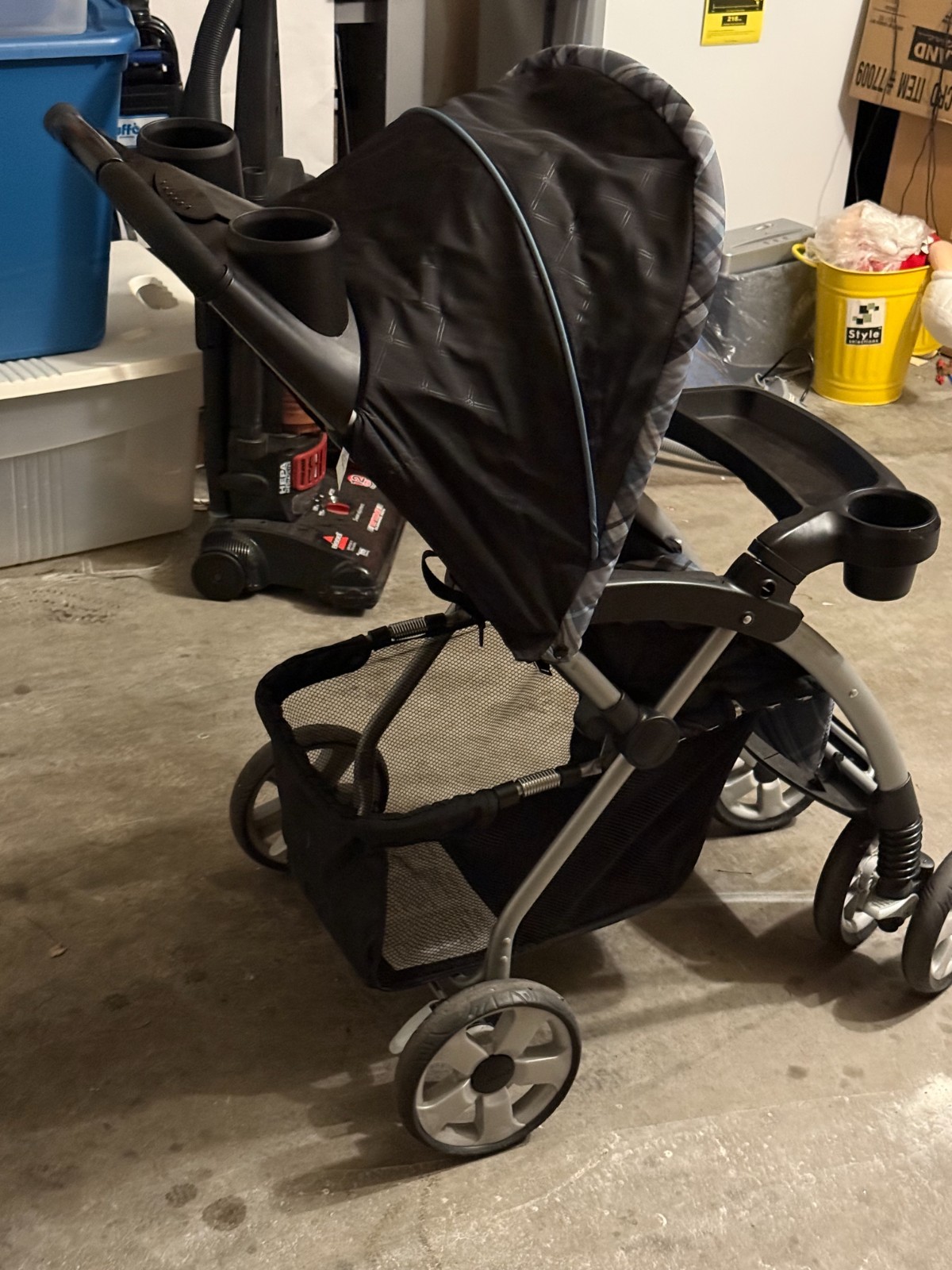 как выглядит Eddie Bauer Single Toddler Stroller featuring a classic blue and gray plaid tar фото