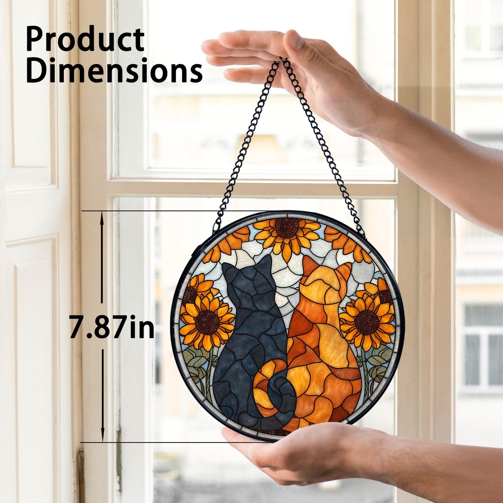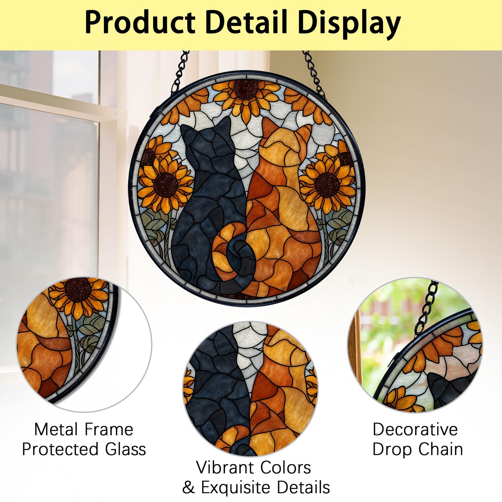 Cat Sunflower Stained Glass Window Hanging, Black Orange Cat Sunflower Suncat...