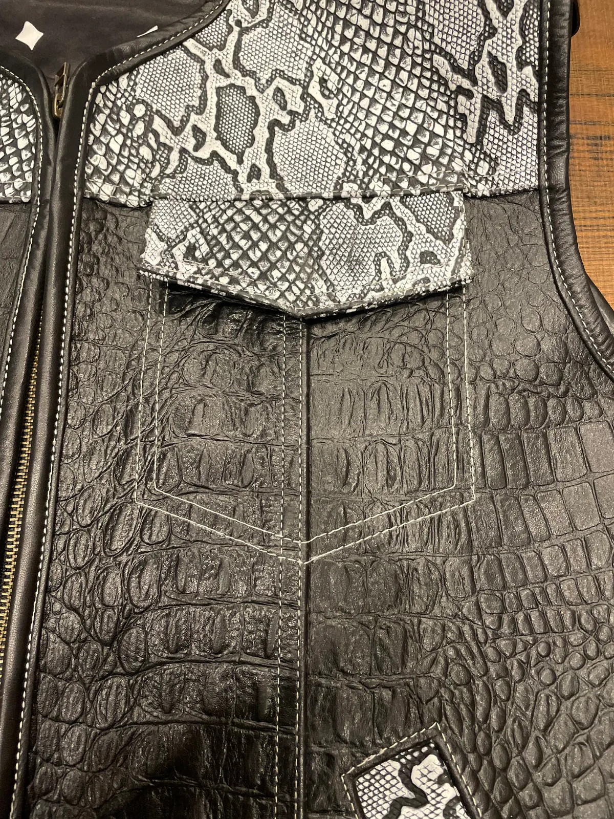 Real Leather Black Embossed Vest with White Skin Detail, Biker Style
