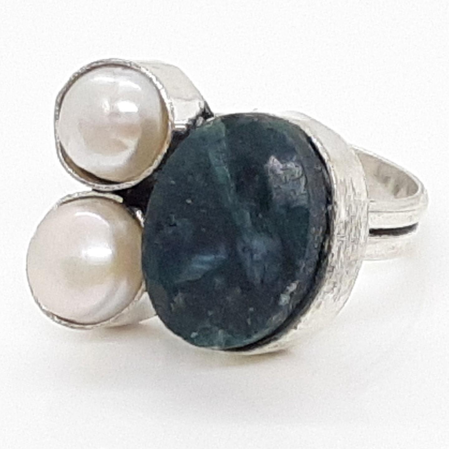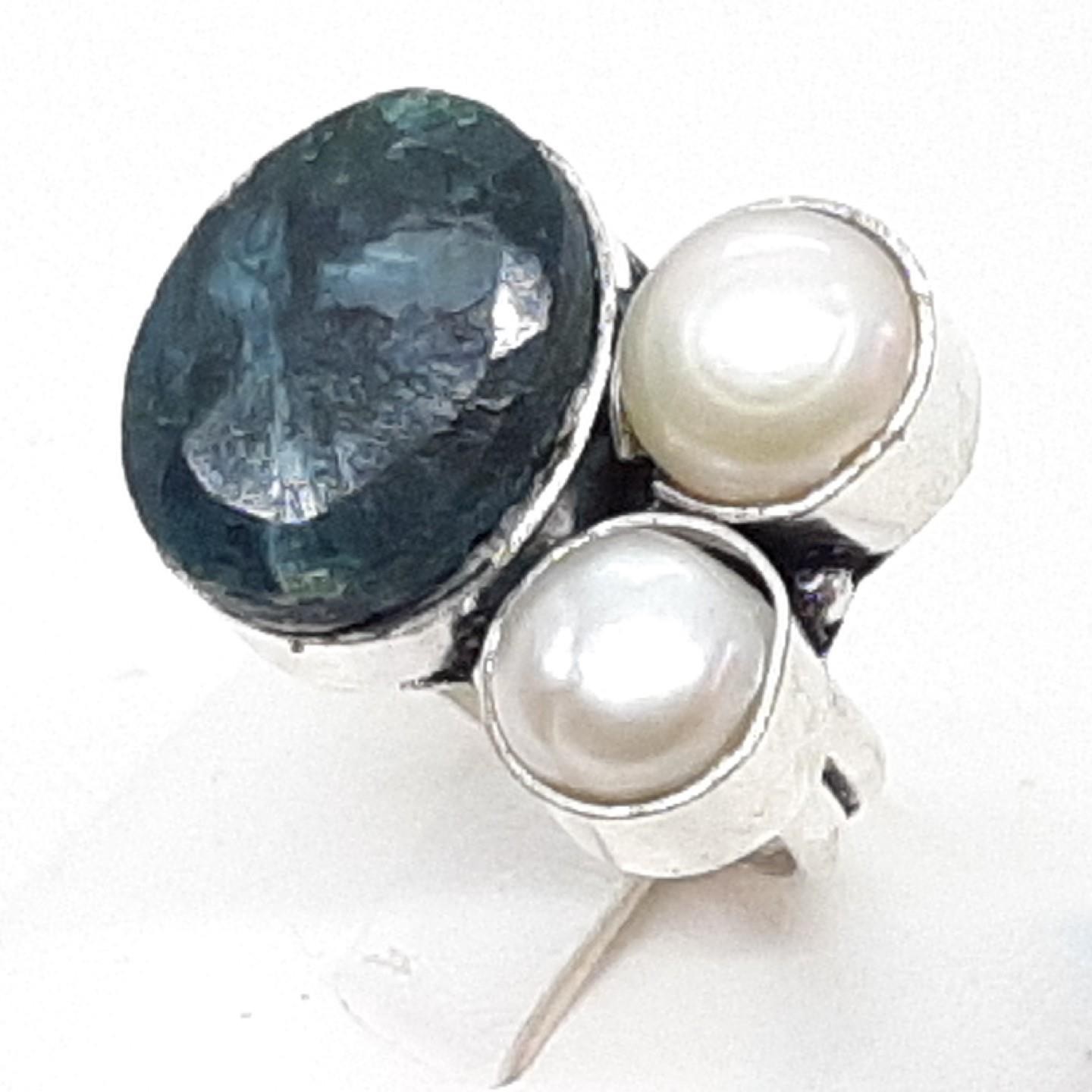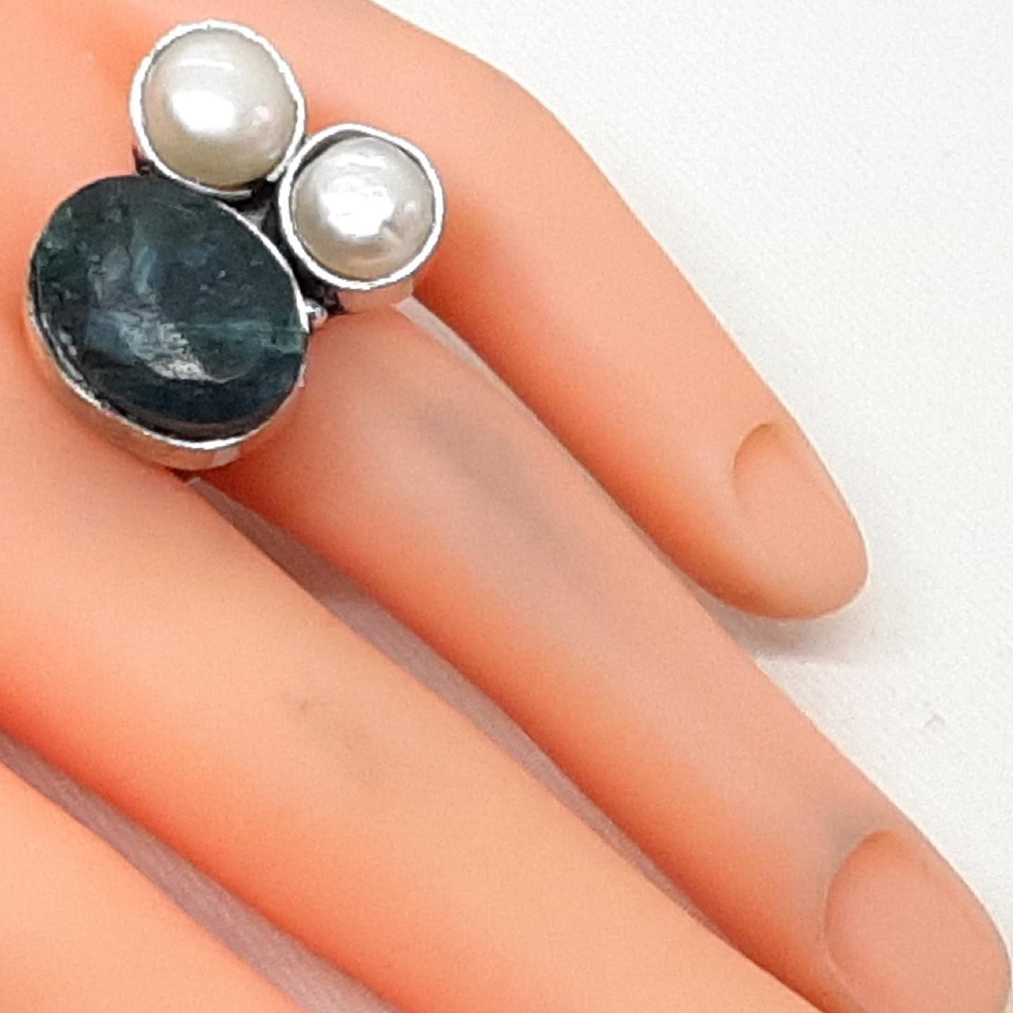 как выглядит Vintage 13.32ctw Green Sapphire Pearl Silver Ring Size 7.5 фото