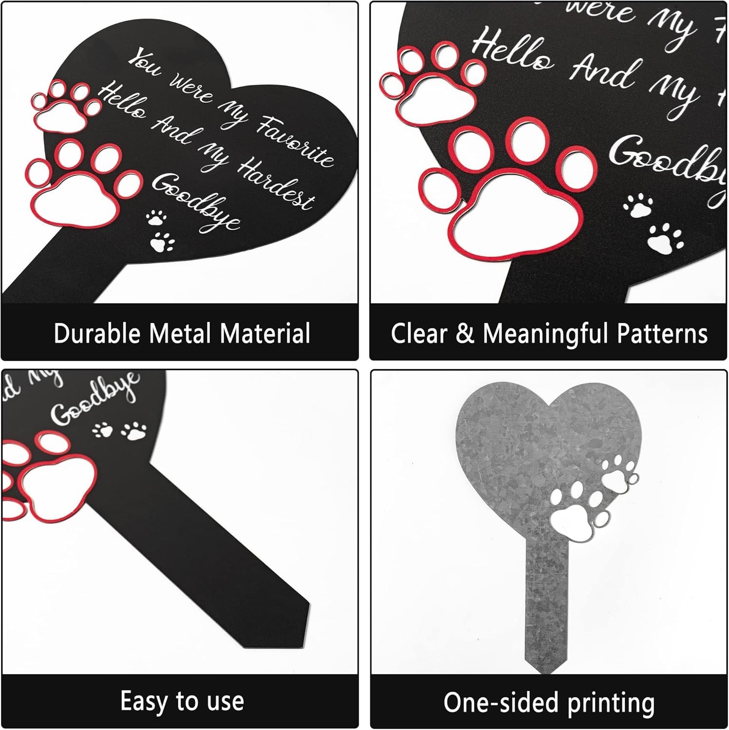 Особенности: Durable, Weather Resistant, Easy to Install, Lightweight, Portable, Metal construction, Paw print design, Heart-shaped tie included, Long tip for easy insertion, Portrait orientation, Suitable for outdoor use, Expresses condolences