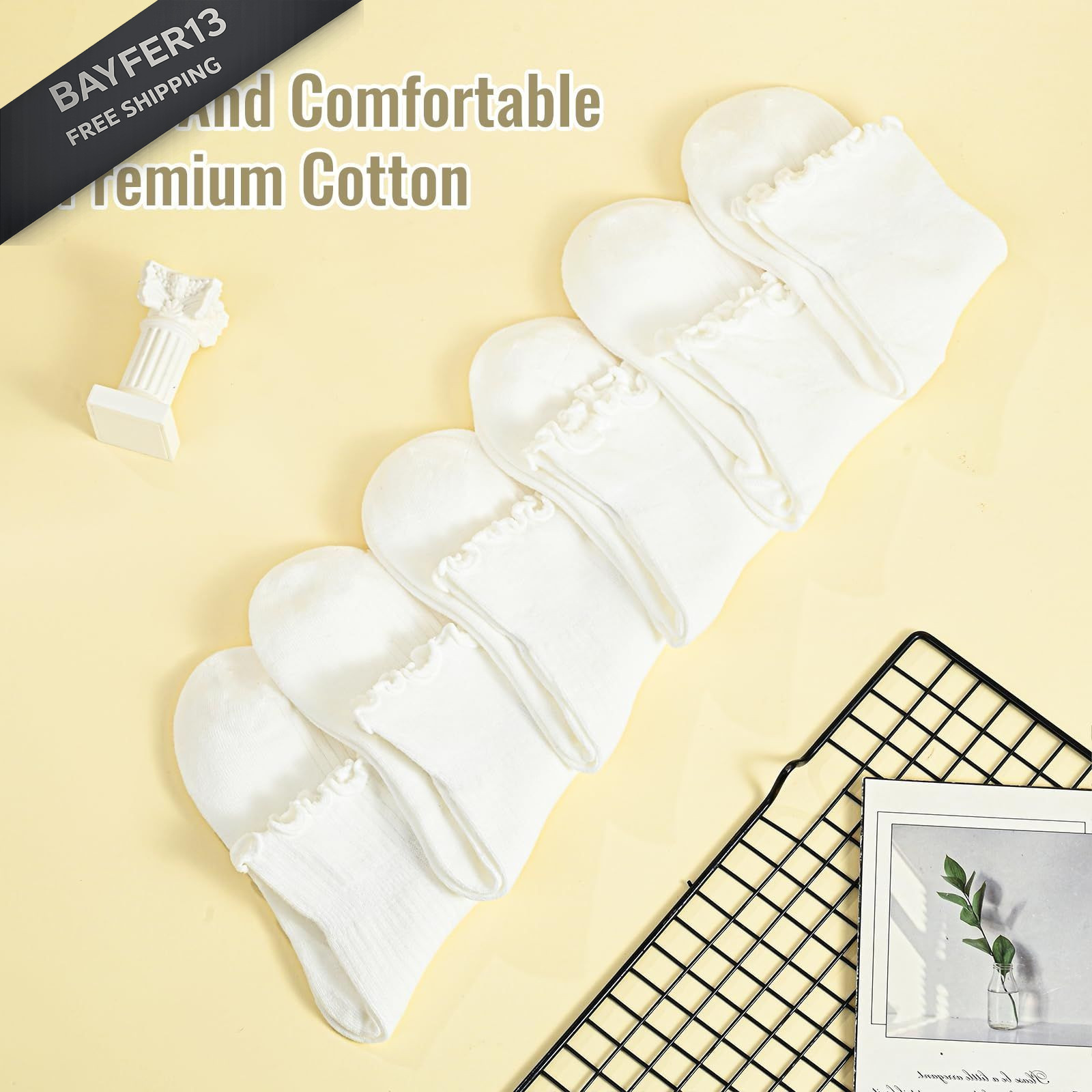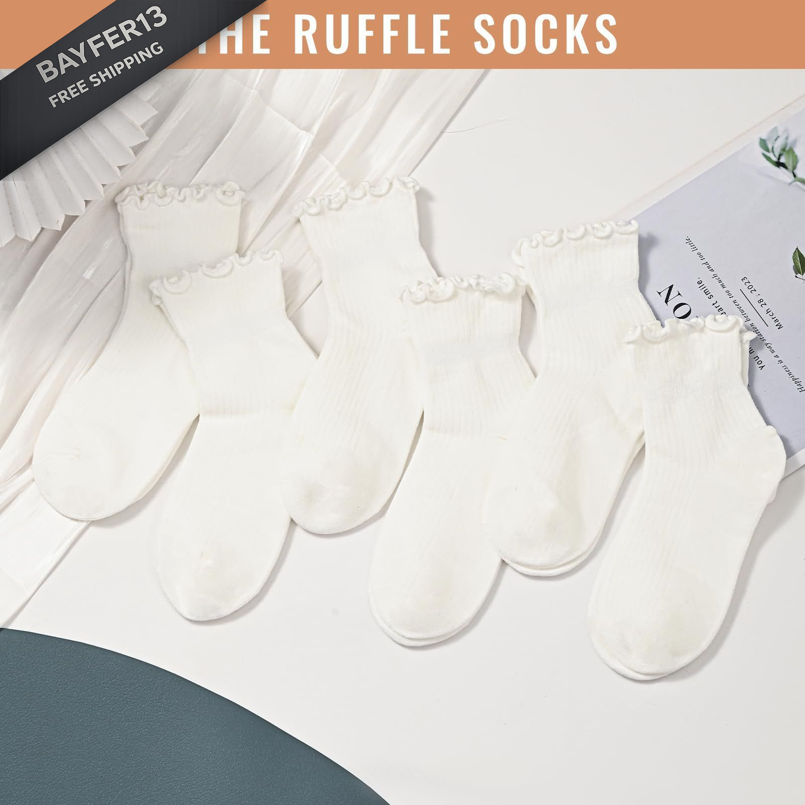 Iridipity 6 Pairs Ruffle Socks Woman Cute Frilly Ankle for 5-9, White