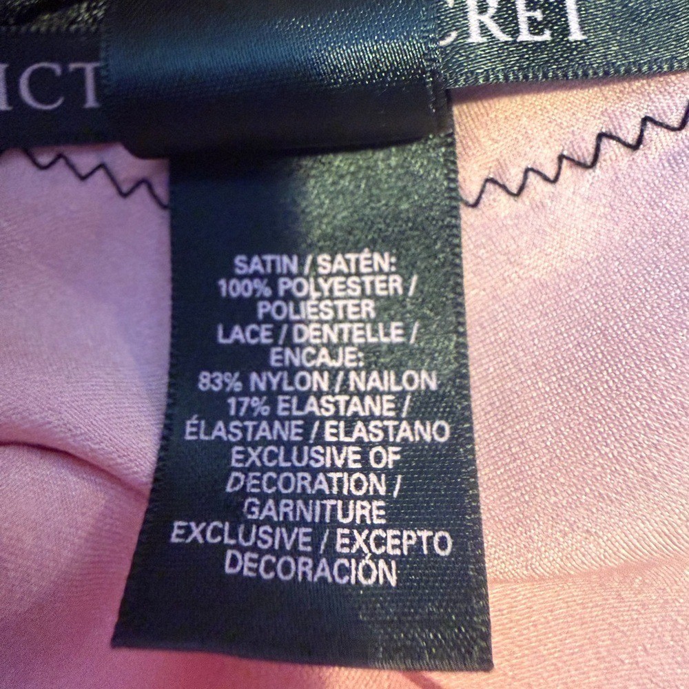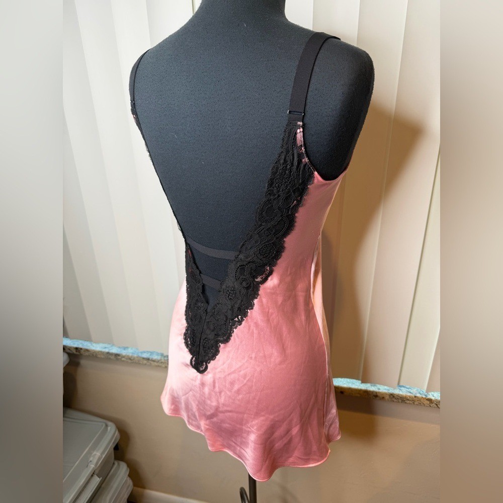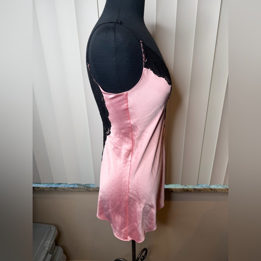как выглядит Victorias Secret pink satin chemise slip dress black lace trim Size S/P фото