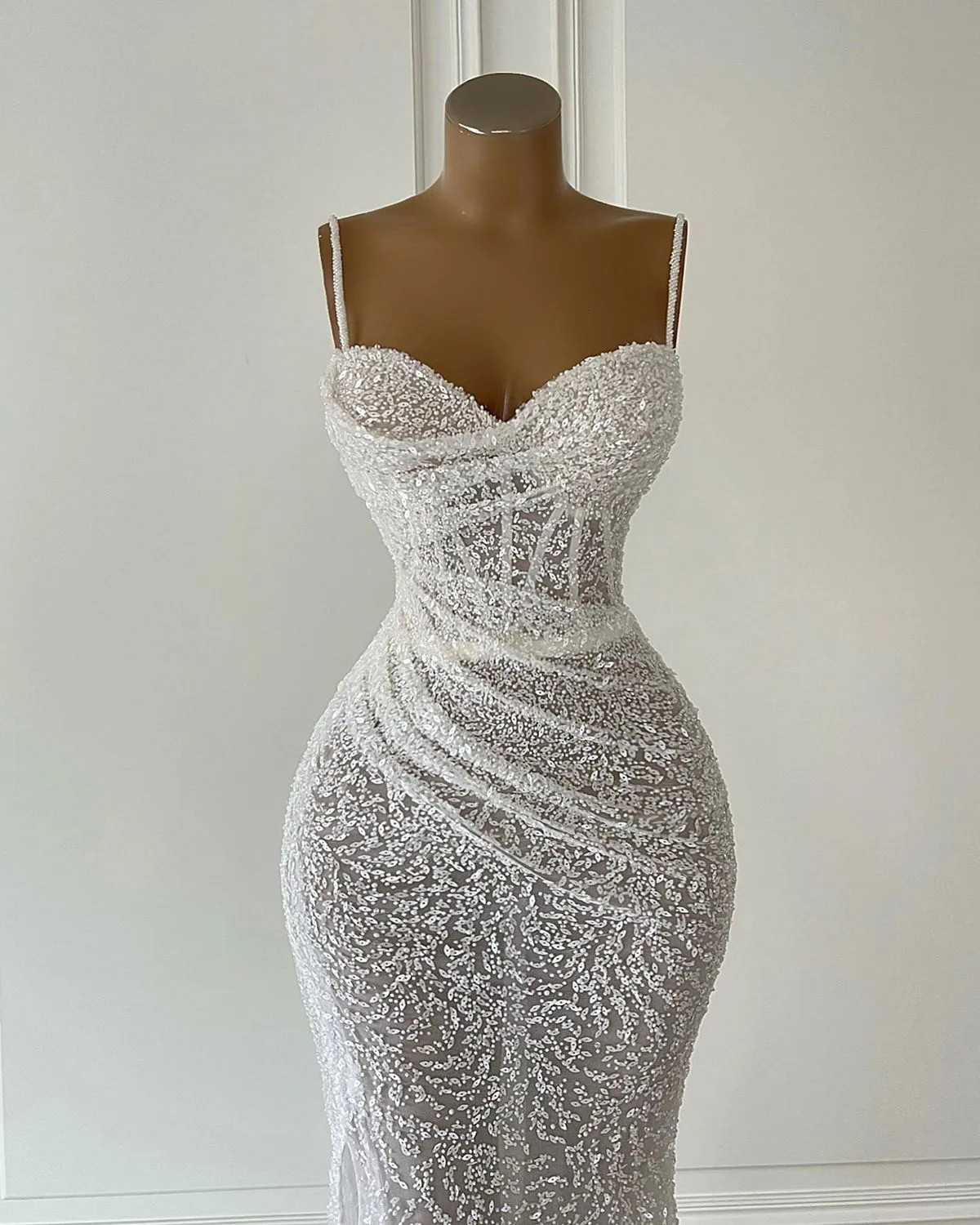 Mermaid Wedding Dresses Spaghetti Bridal Gowns Sequined Illusion Sweep Train