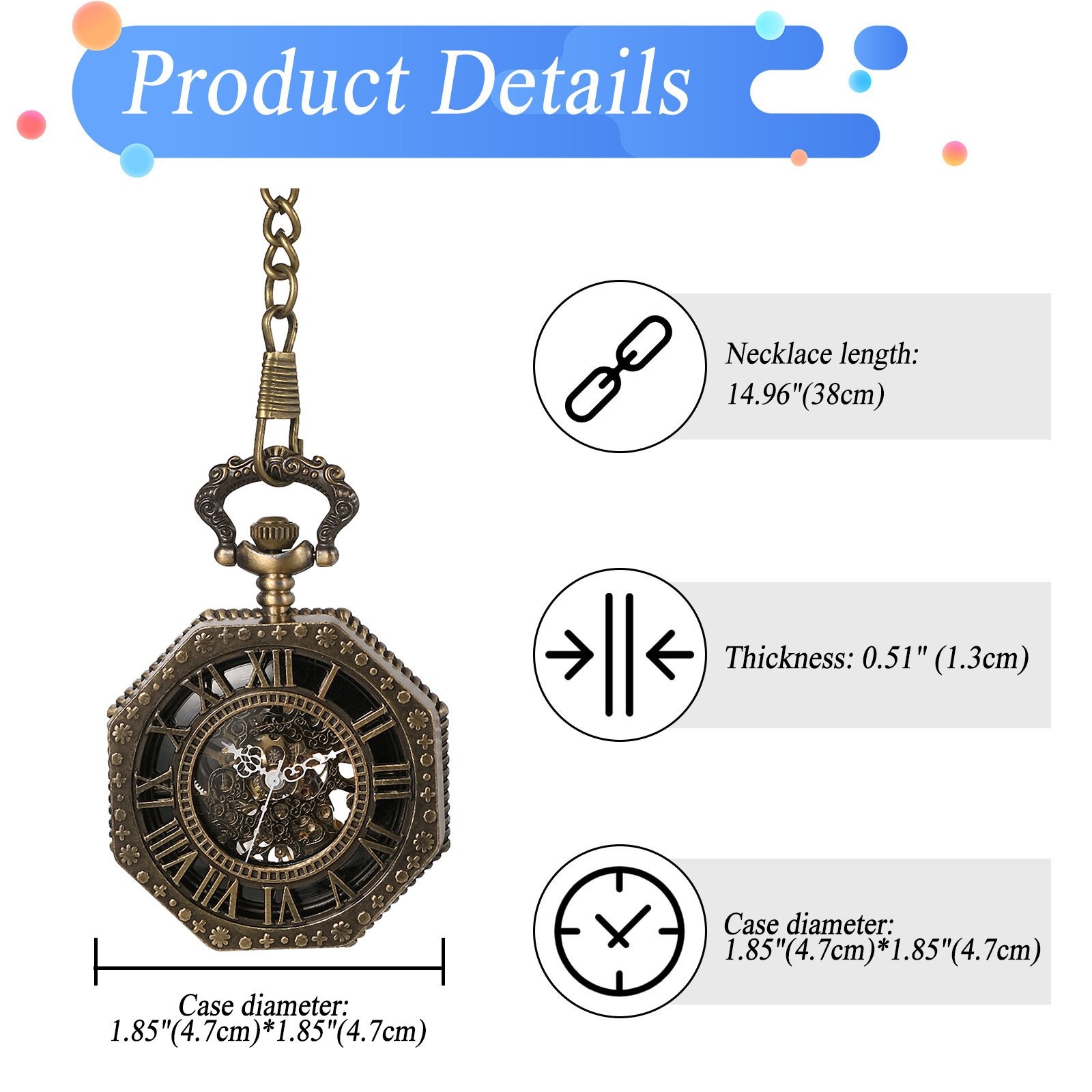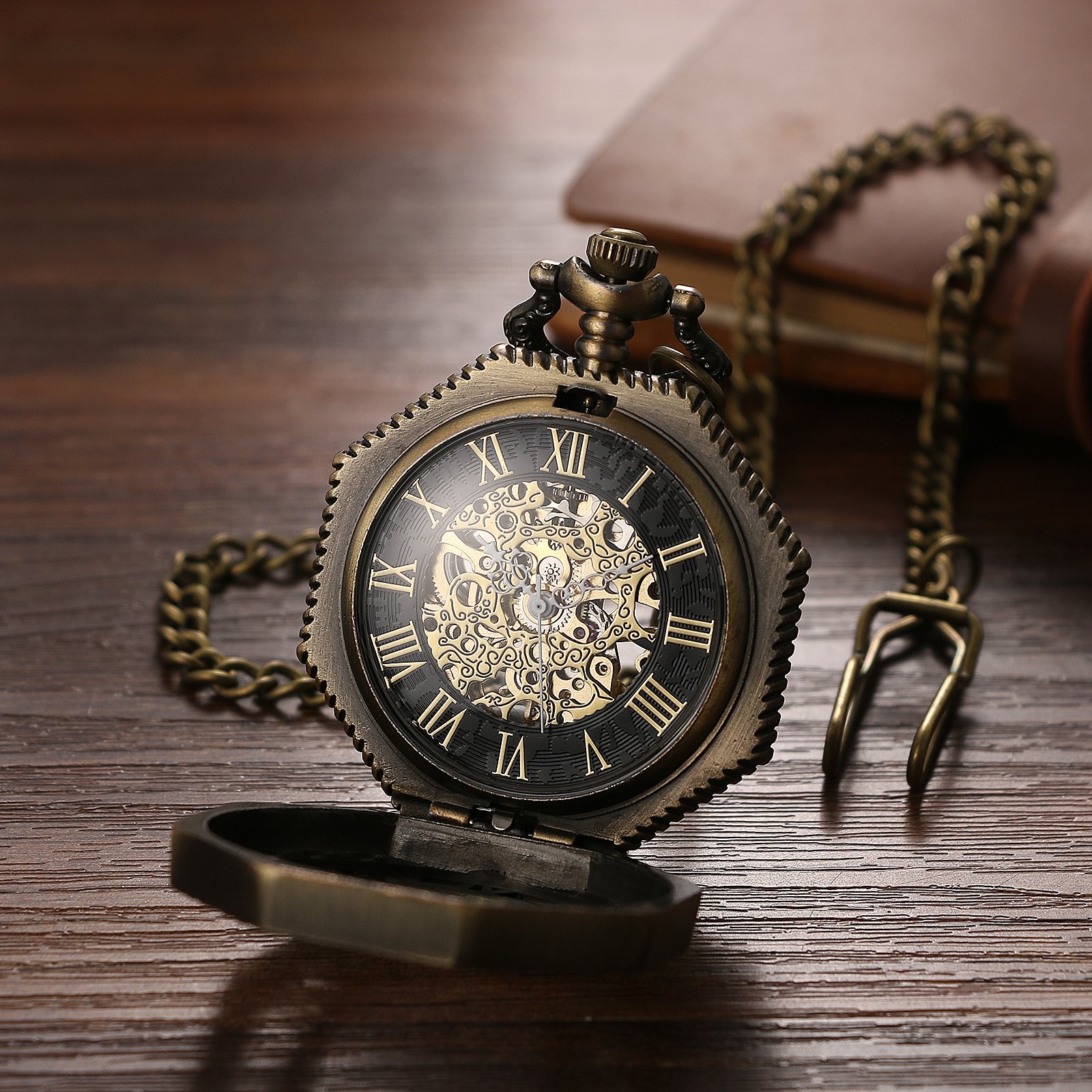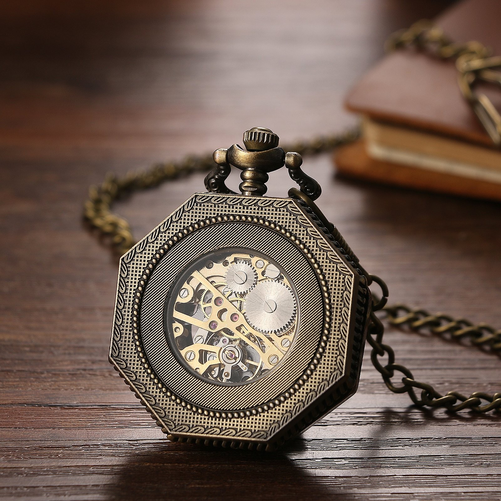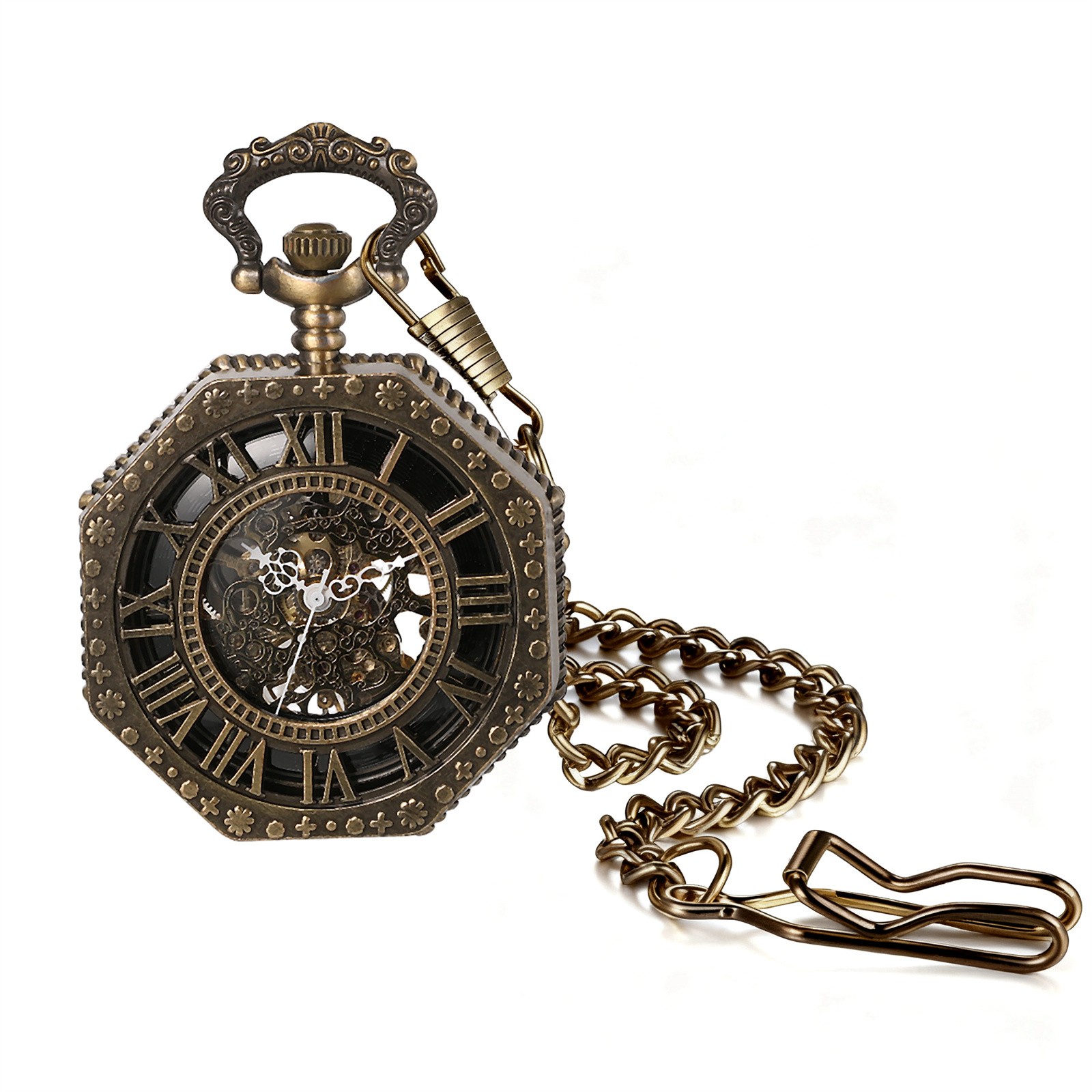 Mens Hallow Octagon Shape Mechanical Steampunk Skeleton Pocket Watch with Chain