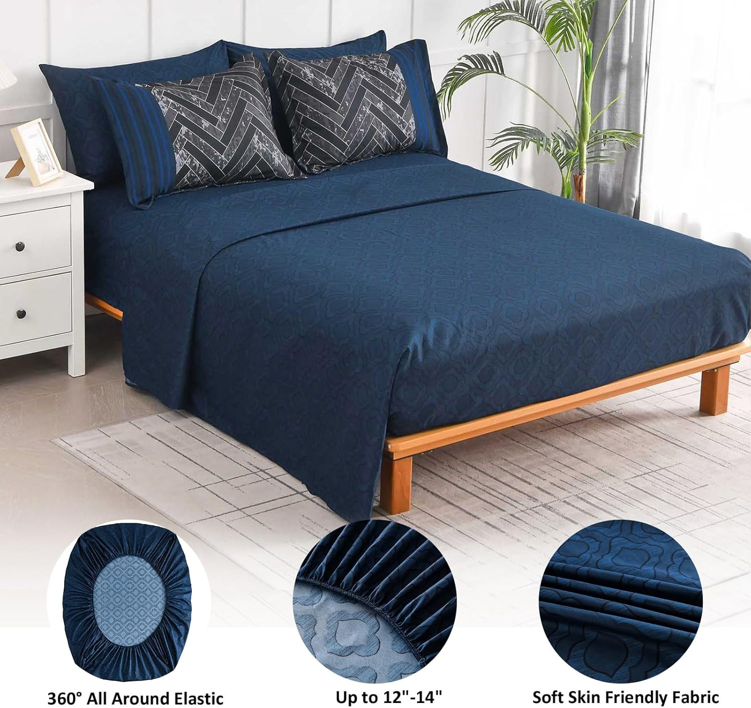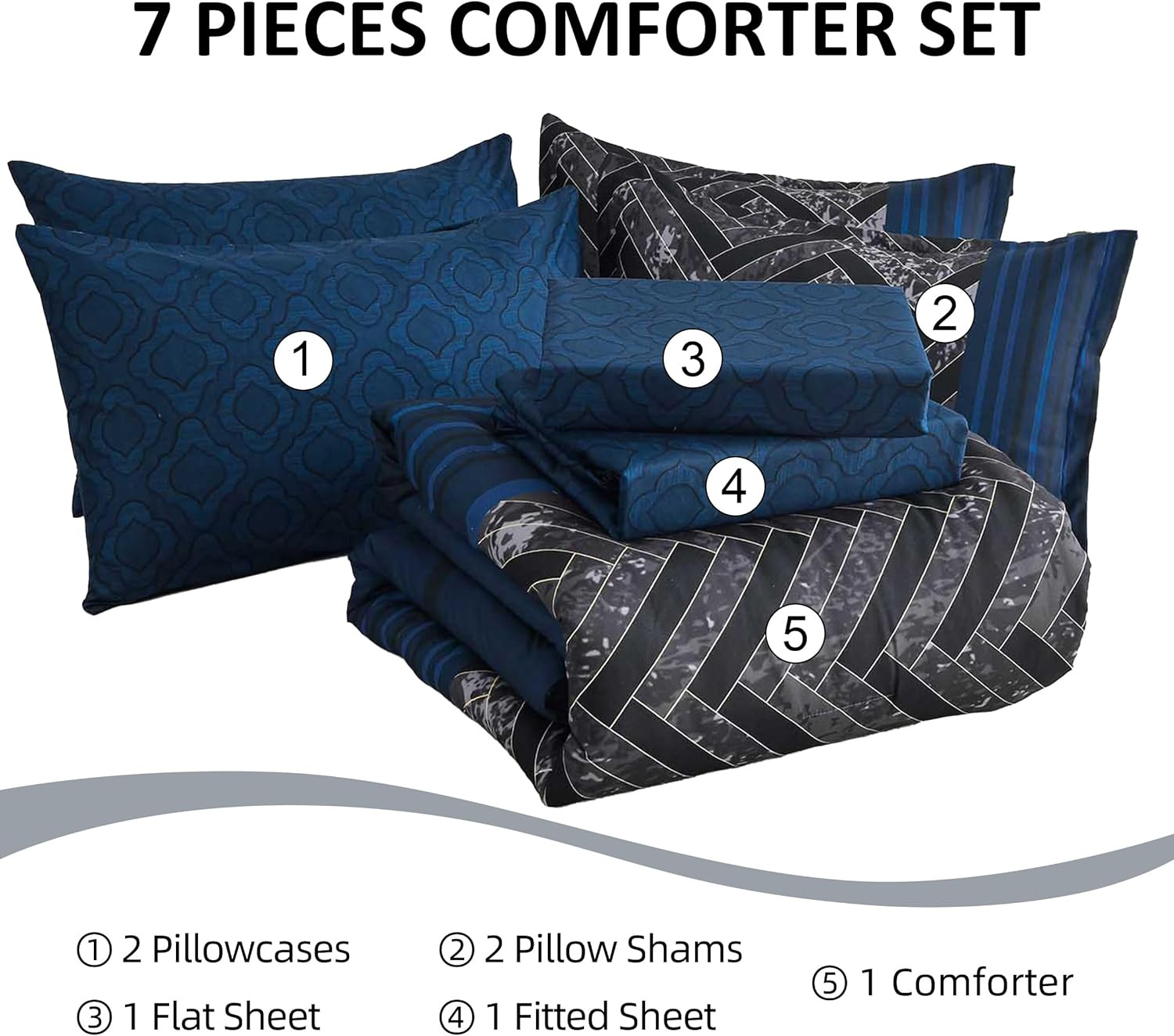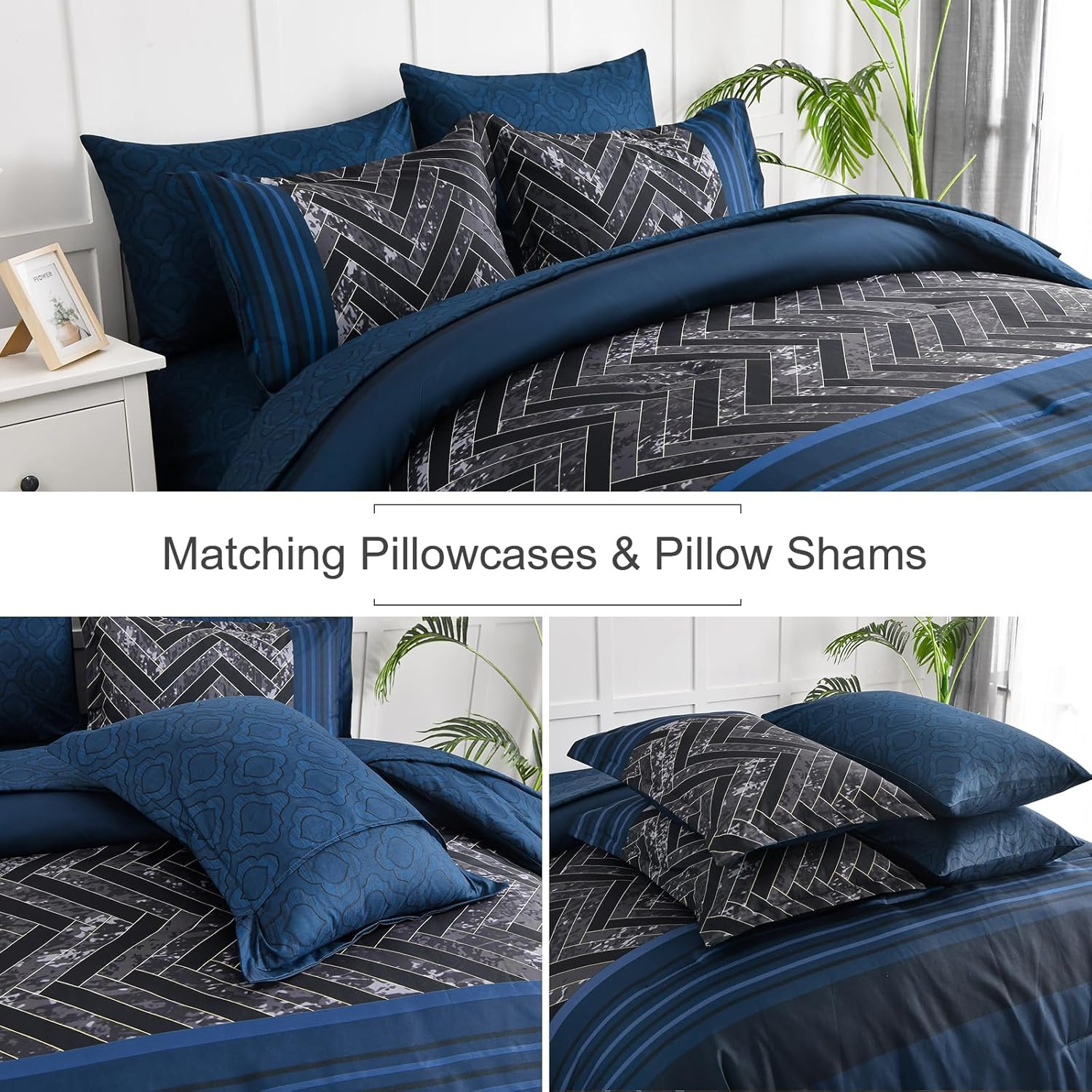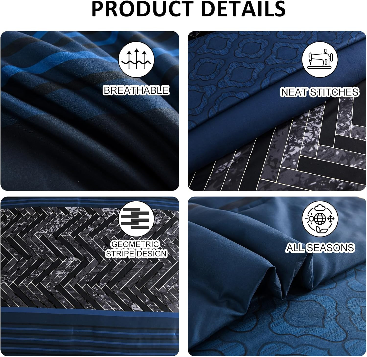 Navy Blue Comforter Set King Size, 7 Pieces Stripe Geometric Bed in a Bag, Soft