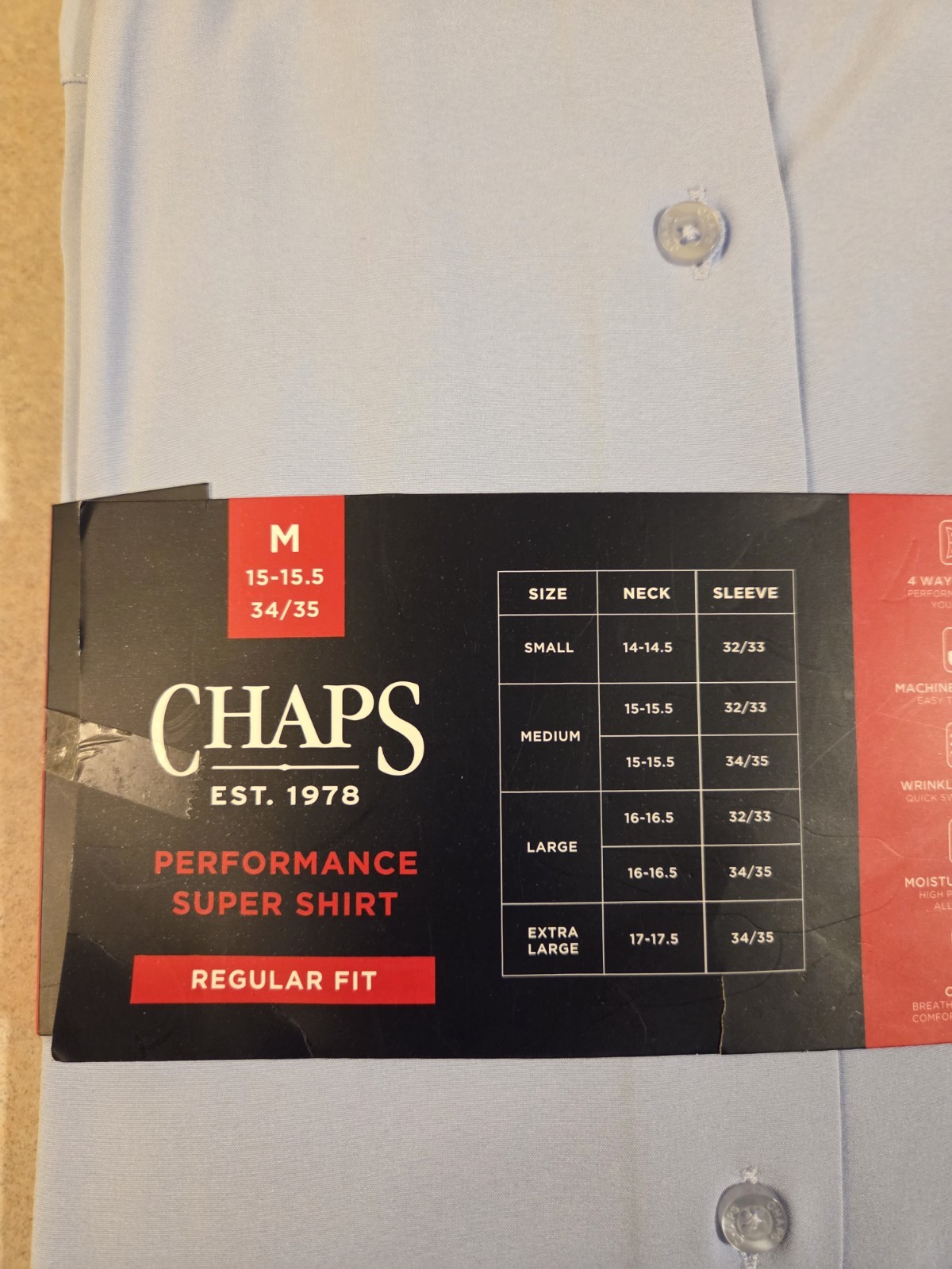 Chaps Men's MEDIUM 15-15.5 34/35 Long Sleeve Performance Dress Shirt BLUE 10726