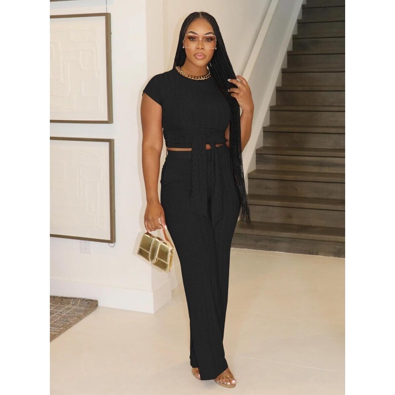 Women's 2pcs Outfit Short Sleeve Belted Crop Tops Wide Leg Pant Tracksuit Sets
