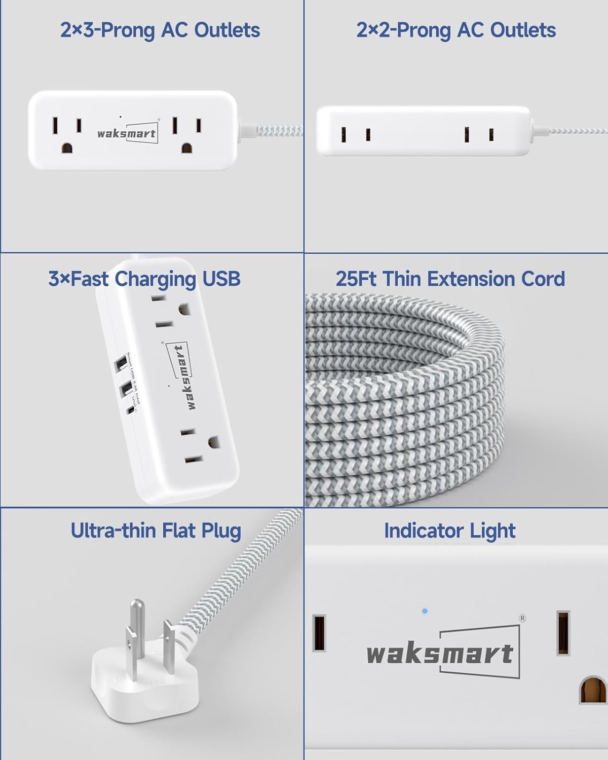 Flat Extension Cord 25FT 4 AC Outlets 3 USB Ports 5V/3.4A 17W Braided Cord