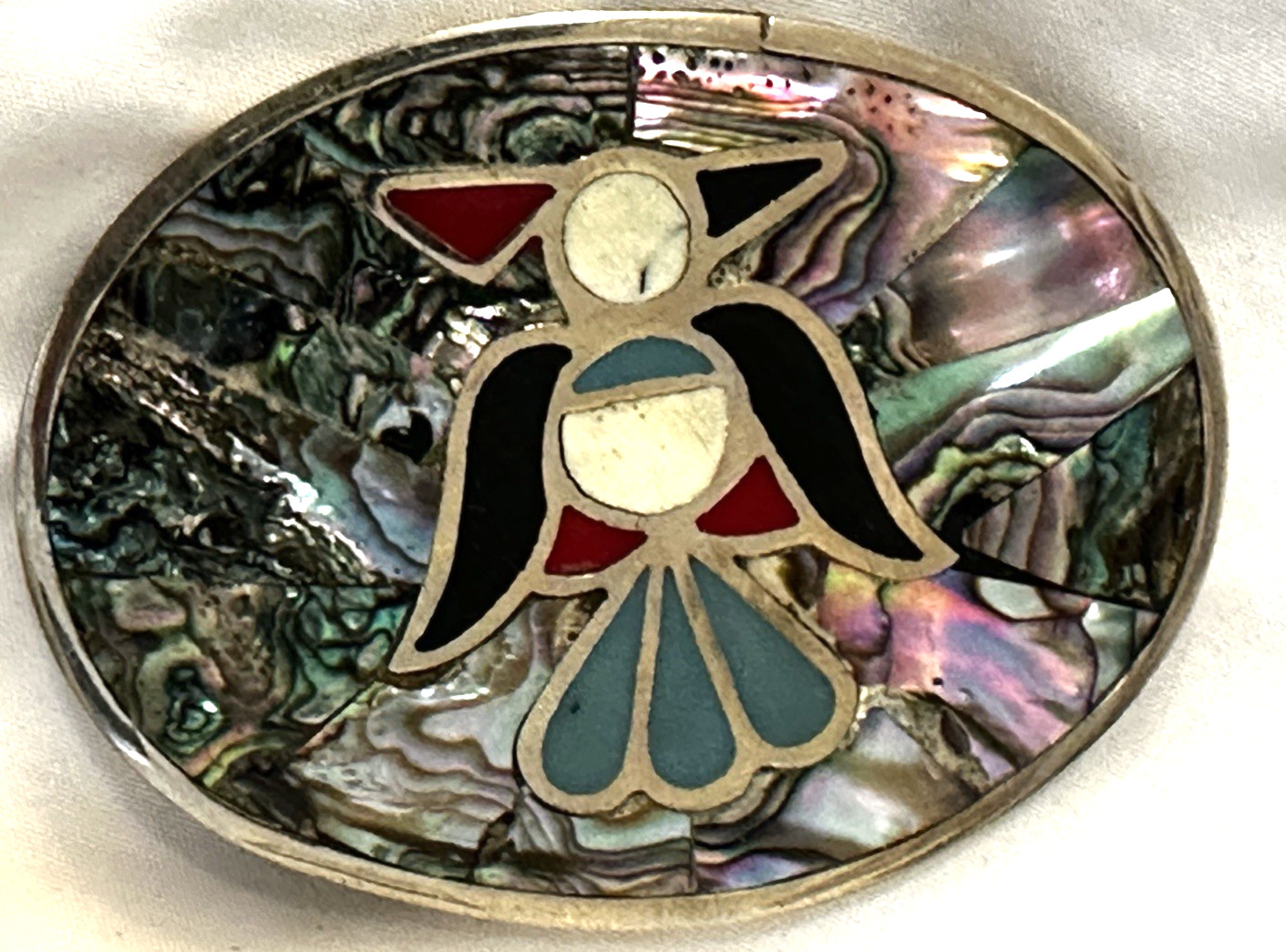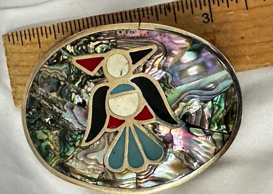 Vintage belt buckle Alpaca MEXICO Abalone shell inlay oval shape 3.25x2.5"
