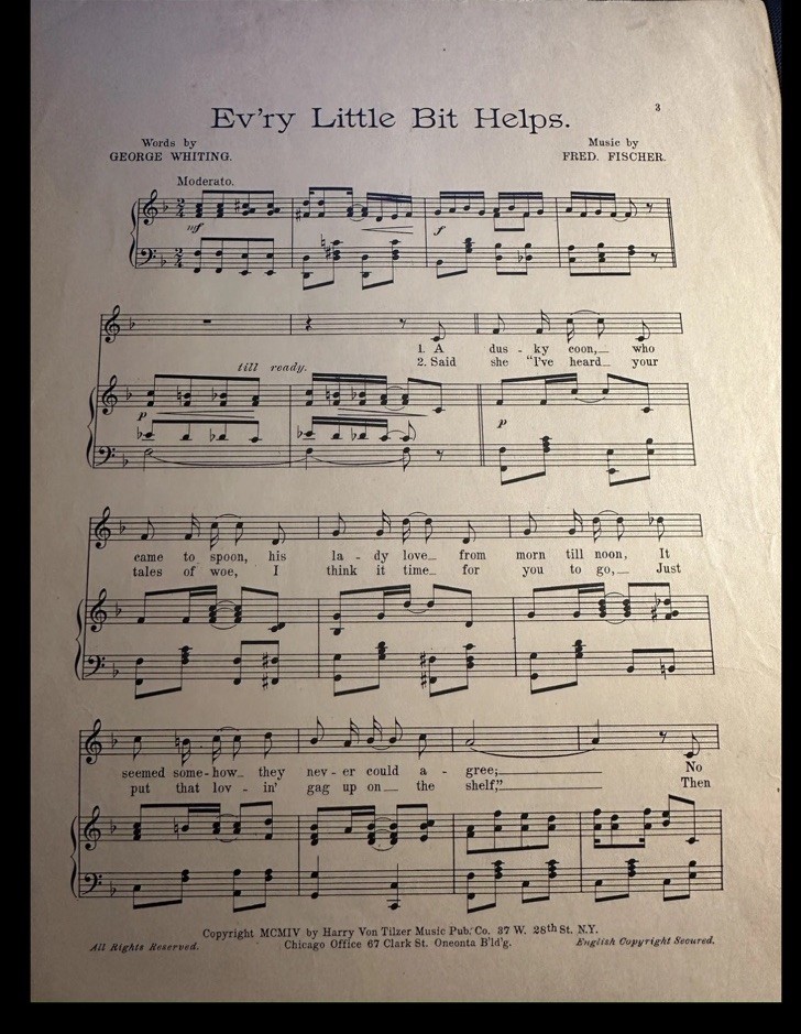 A 1904 11x14 Ragtime Sheet Music EV RY LITTLE BIT HELPS by Fred Fischer
