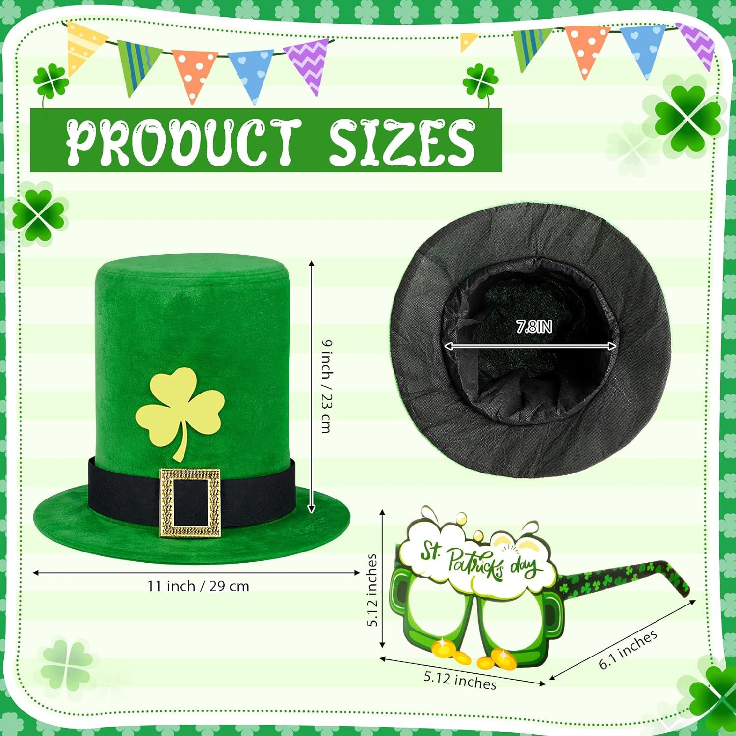 как выглядит 21 Pcs St. PatrickS Day Costume 3 Green Top Hat 12 Shamrock Glasses with 6 Hair фото