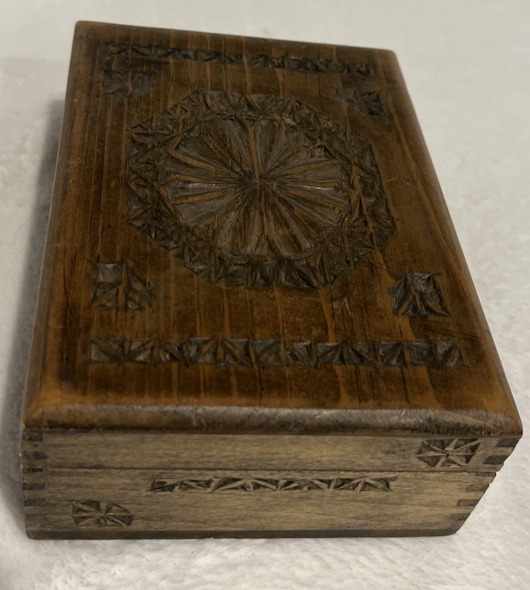 • Vintage Hand Carved Wood Wooden Trinket Storage dovetailed Box with Hinged Lid