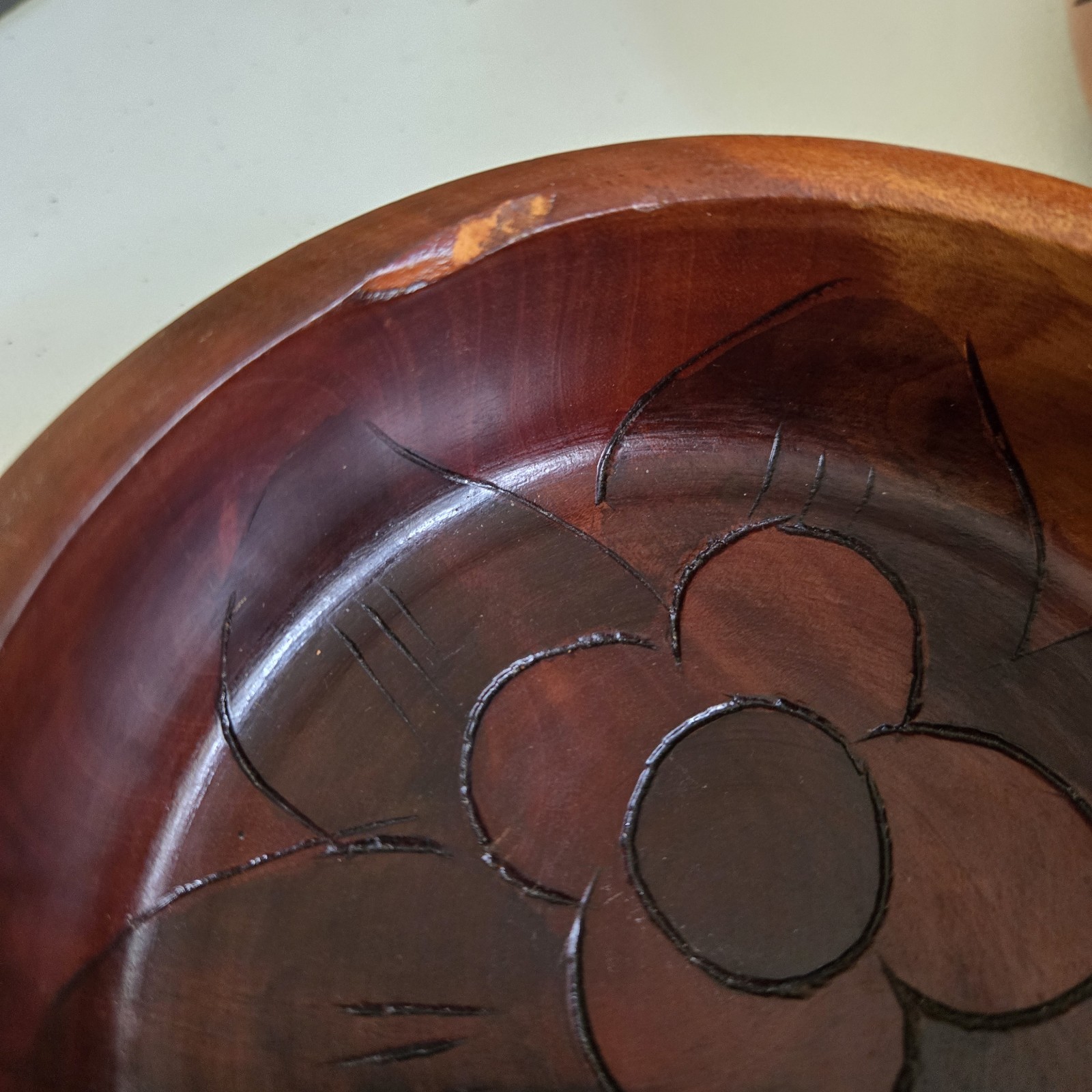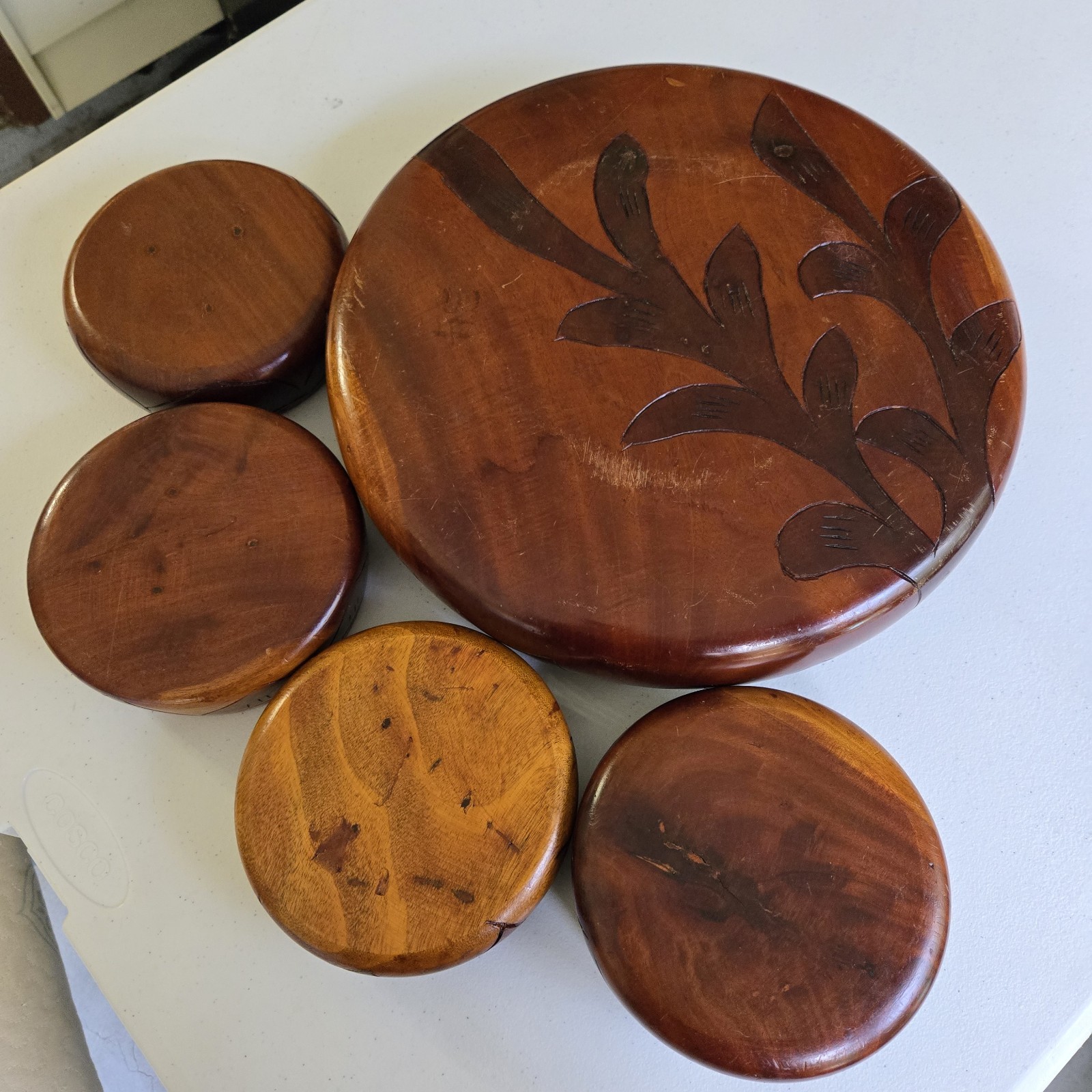 • Hand Carved Flower Wooden Salad Bowl with 4 Small Bowls