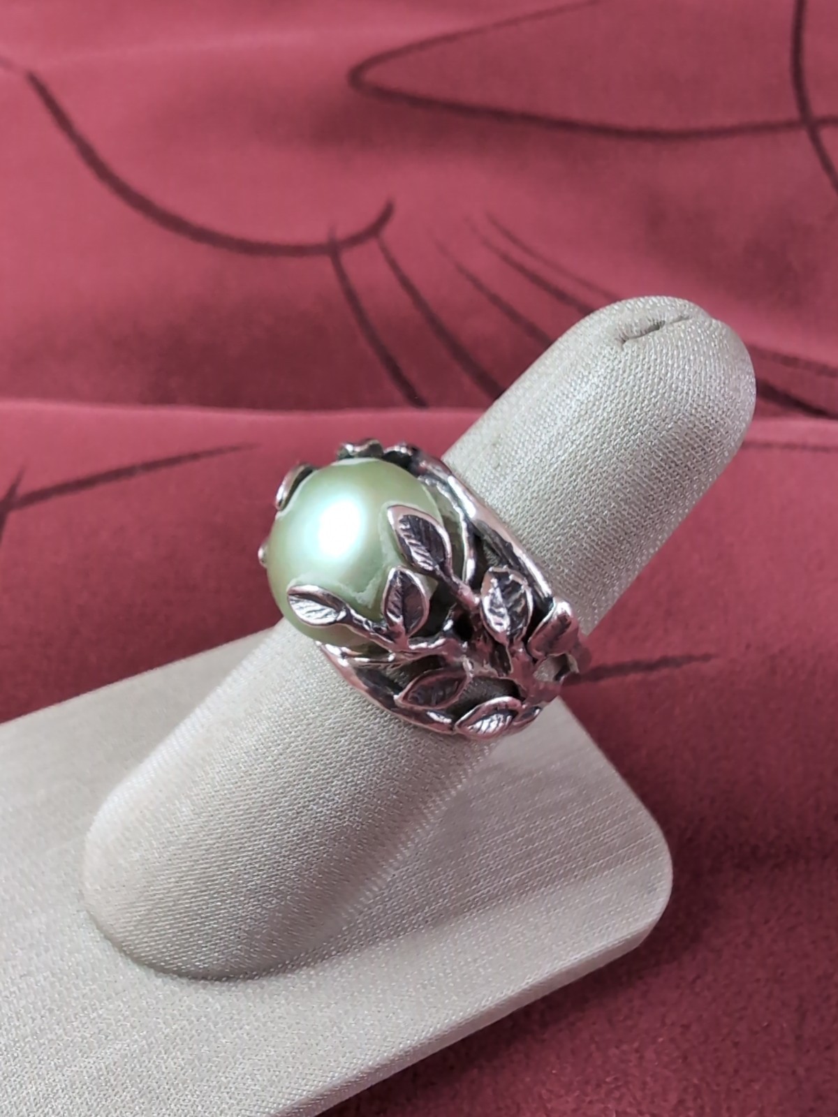 как выглядит Gorgeous Vintage Paz Israel Green Pearl Sterling Silver 925 Leaves Ring Sz 7.75 фото