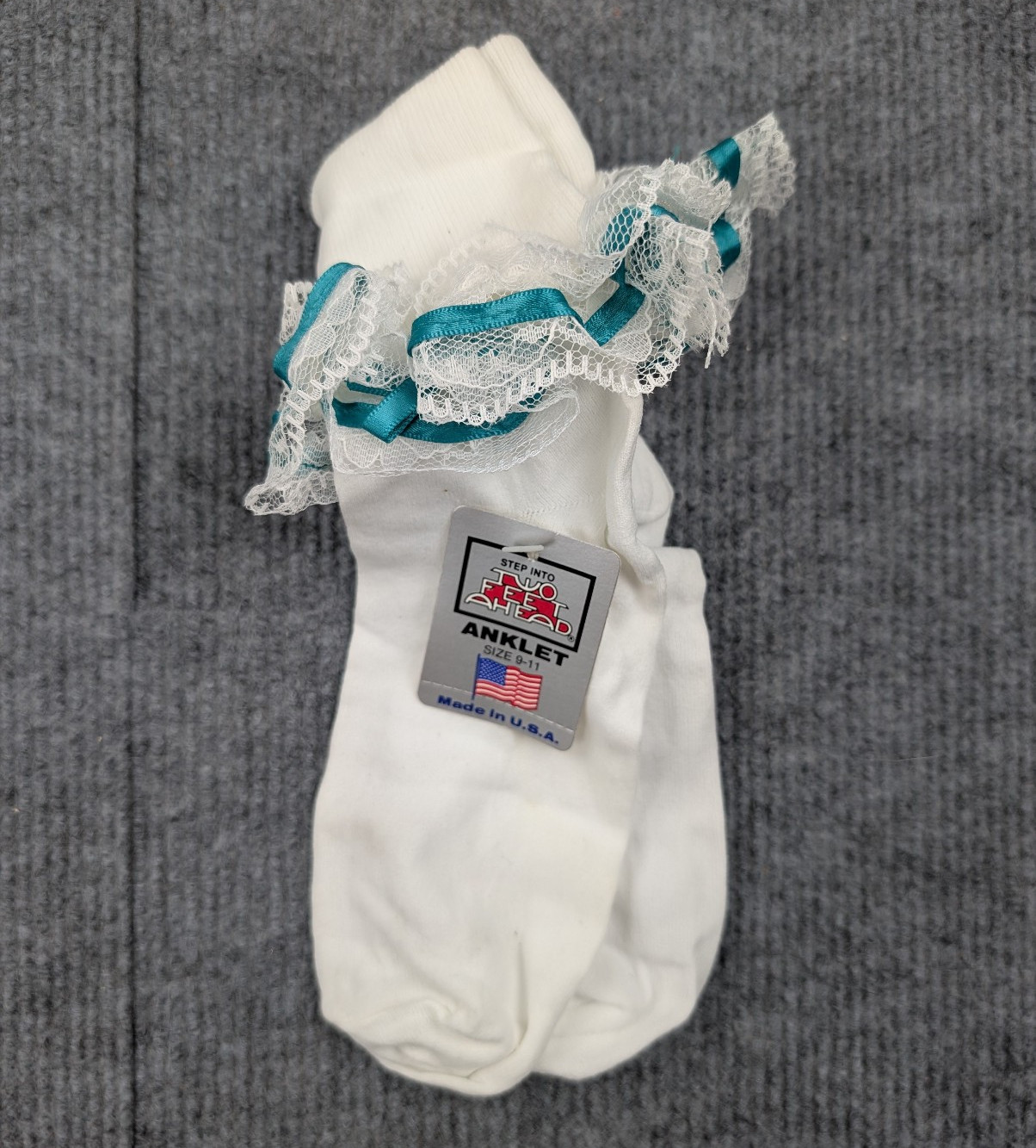 Vintage Lace Ruffle Socks Womens 9-11 Nylon Coquette White Teal Frilly Retro 60s
