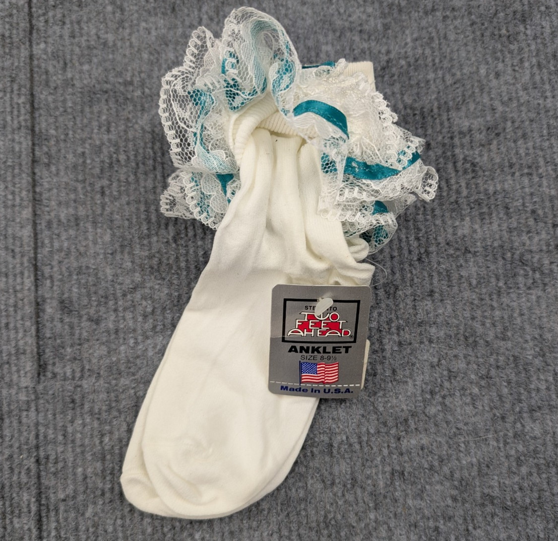 Vintage Nylon Socks Womens 8-9.5 Coquette Cream Teal Frilly Church Event Glam