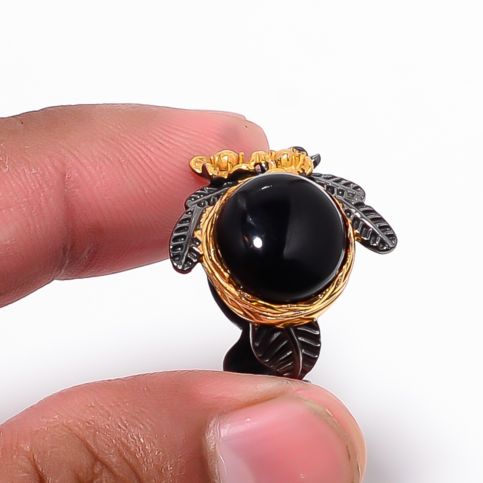 Black Onyx - Brazil Black And Gold Plated 925 Sterling Silver Ring S.8 R87327