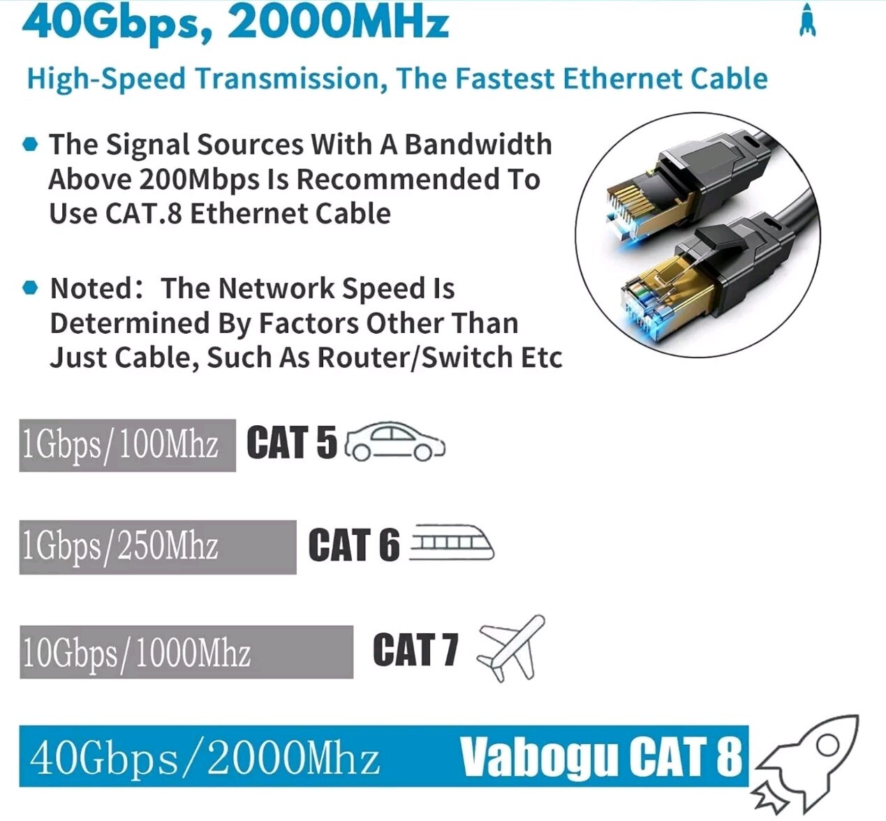 Cat 8 Ethernet Cable Super Speed 40Gbps/2000Mhz RJ45 Connector Ethernet Cord