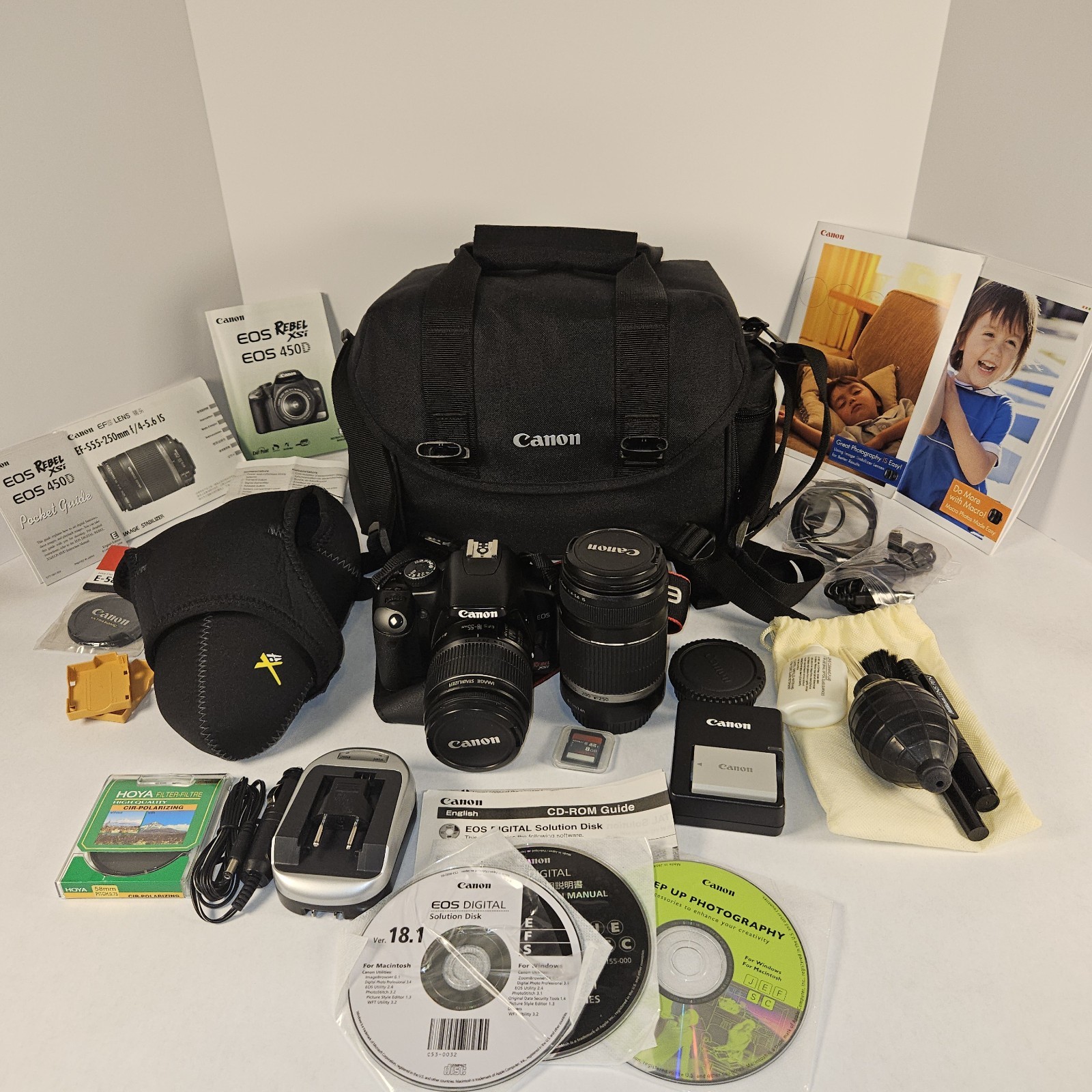 Canon EOS Rebel XSi / 450D 12.2 MP 18-55 55-250 Lenses Battery Charger Case Card