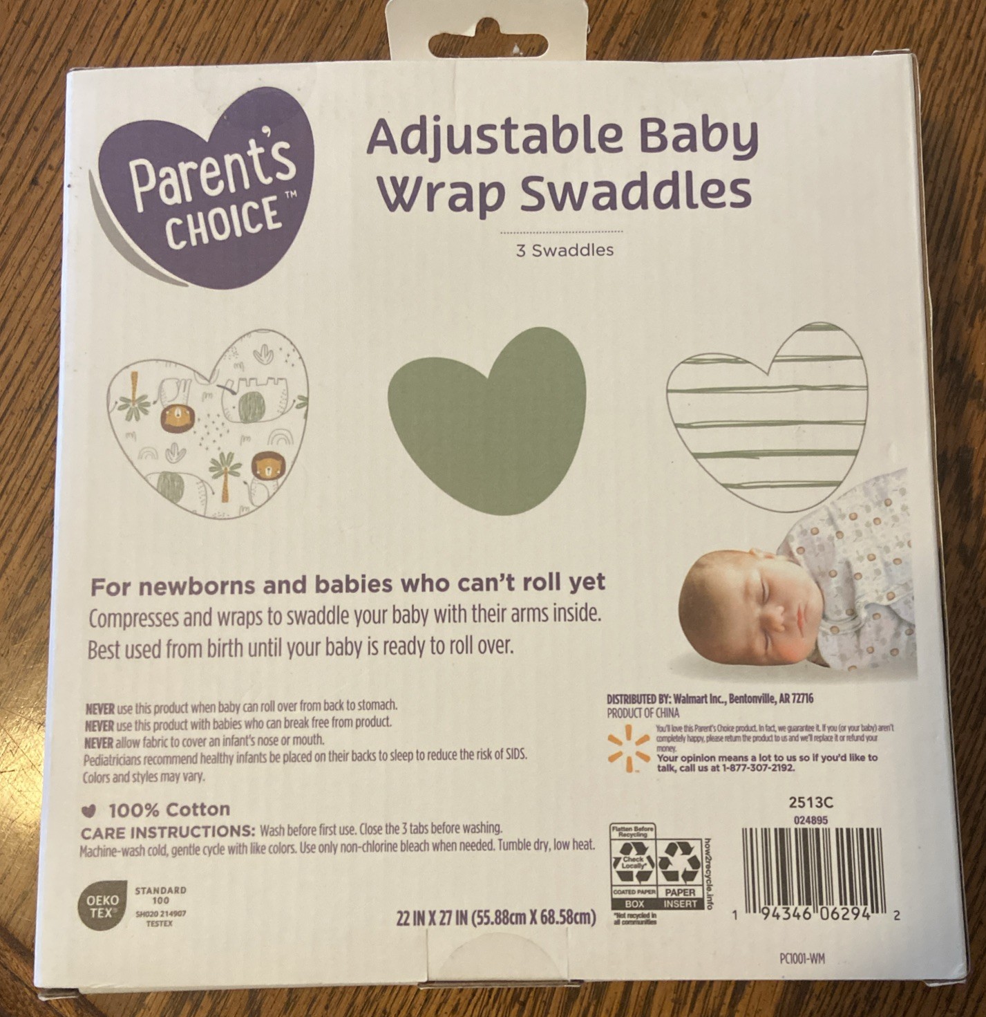 Parent's Choice Adjustable Baby Wrap Swaddles 100 Cotton 3 Pack Gender Nuutral