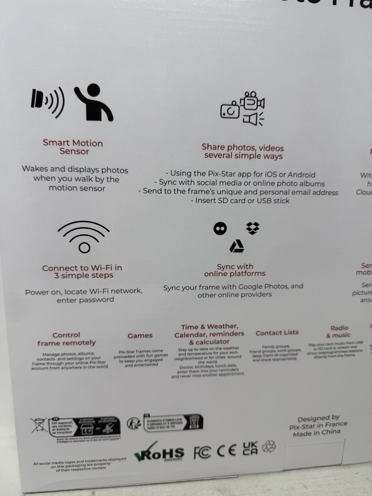 Особенности: Built-in Speakers, Calendar, Clock, Motion Sensor, Rechargeable Battery, Wall-Mountable, Put Pictures On From The App From Anywhere, Touchscreen, Play Music From Preprogrammed Station Or SD Card Or USB, Time, Weather, Calandar, Reminders, Calculator, Preloaded Games, Free Cloud Storage For Life