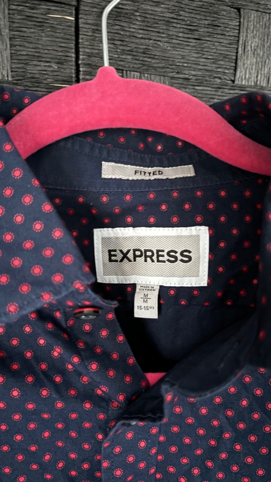 Express Men's Large Blue and Red Floral Spotted Fitted Long Sleeve Dress Shirt