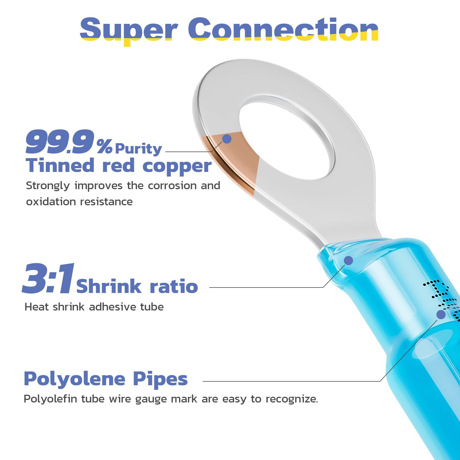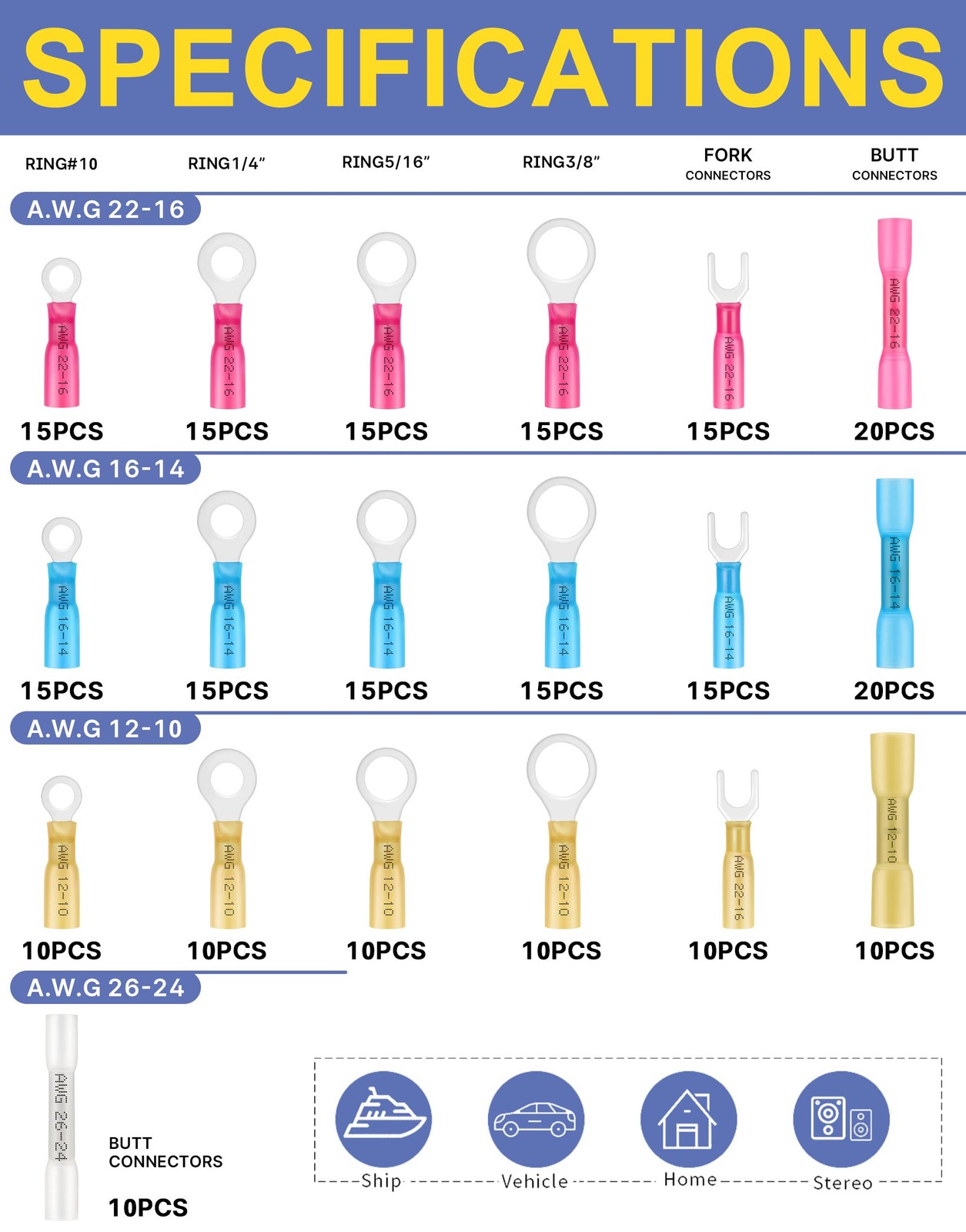 260PCS Heat Shrink Wire Connectors - Marine Grade AWG 26-10 Tinned Red Copper...