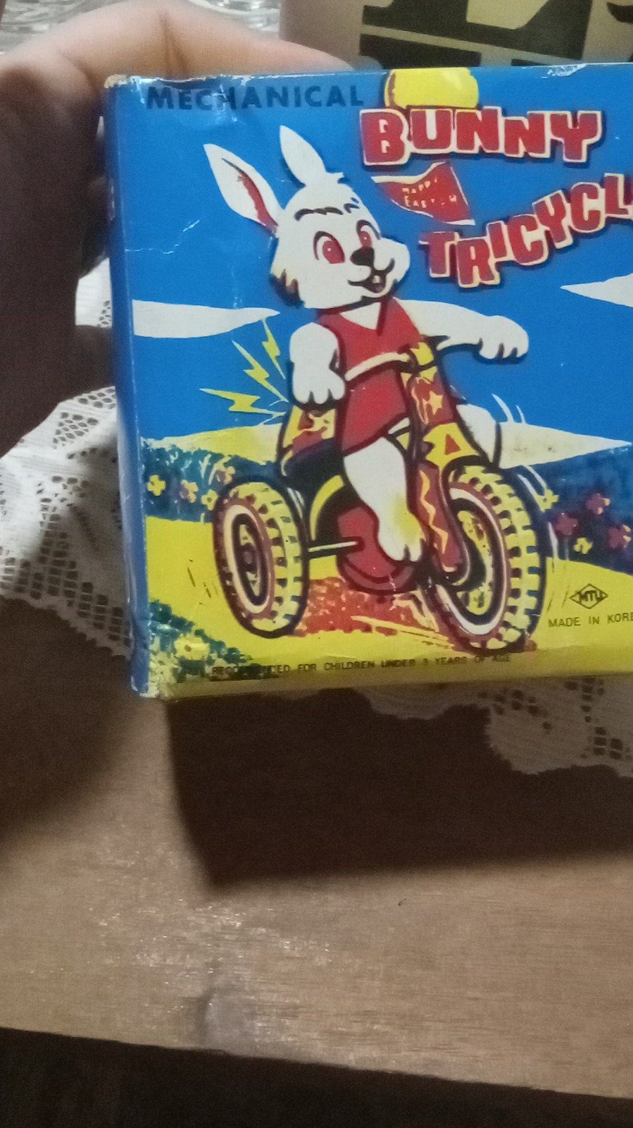 Vintage Mechanical Bunny Tricycle Wind-up Toy with Box and Flag Balloon