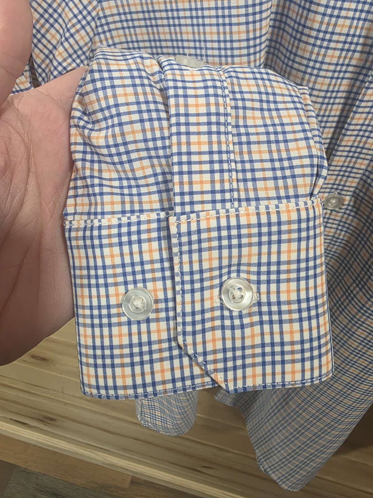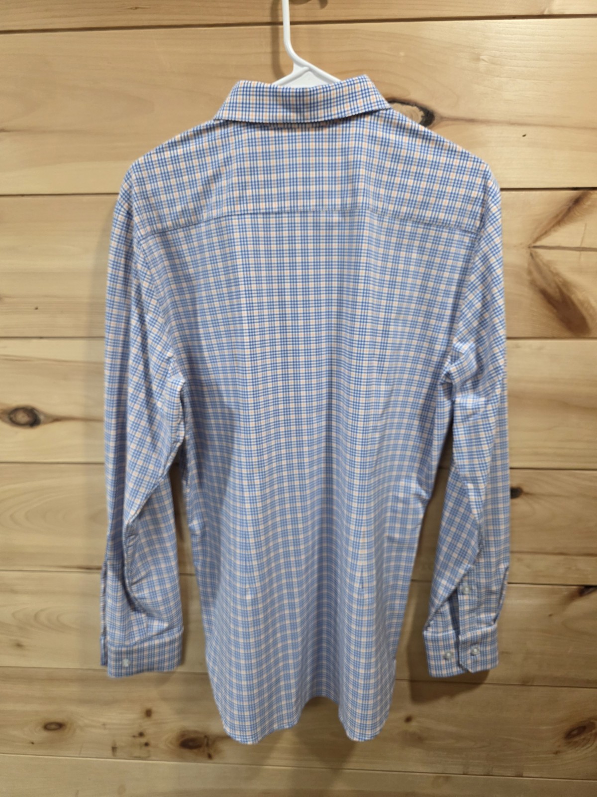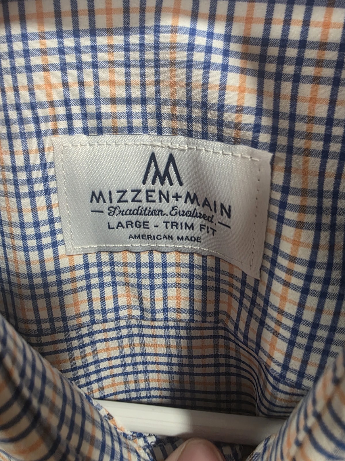 как выглядит Mizzen Main Dress Shirt Large Trim Fit Blue Orange Check Performance Stretch фото
