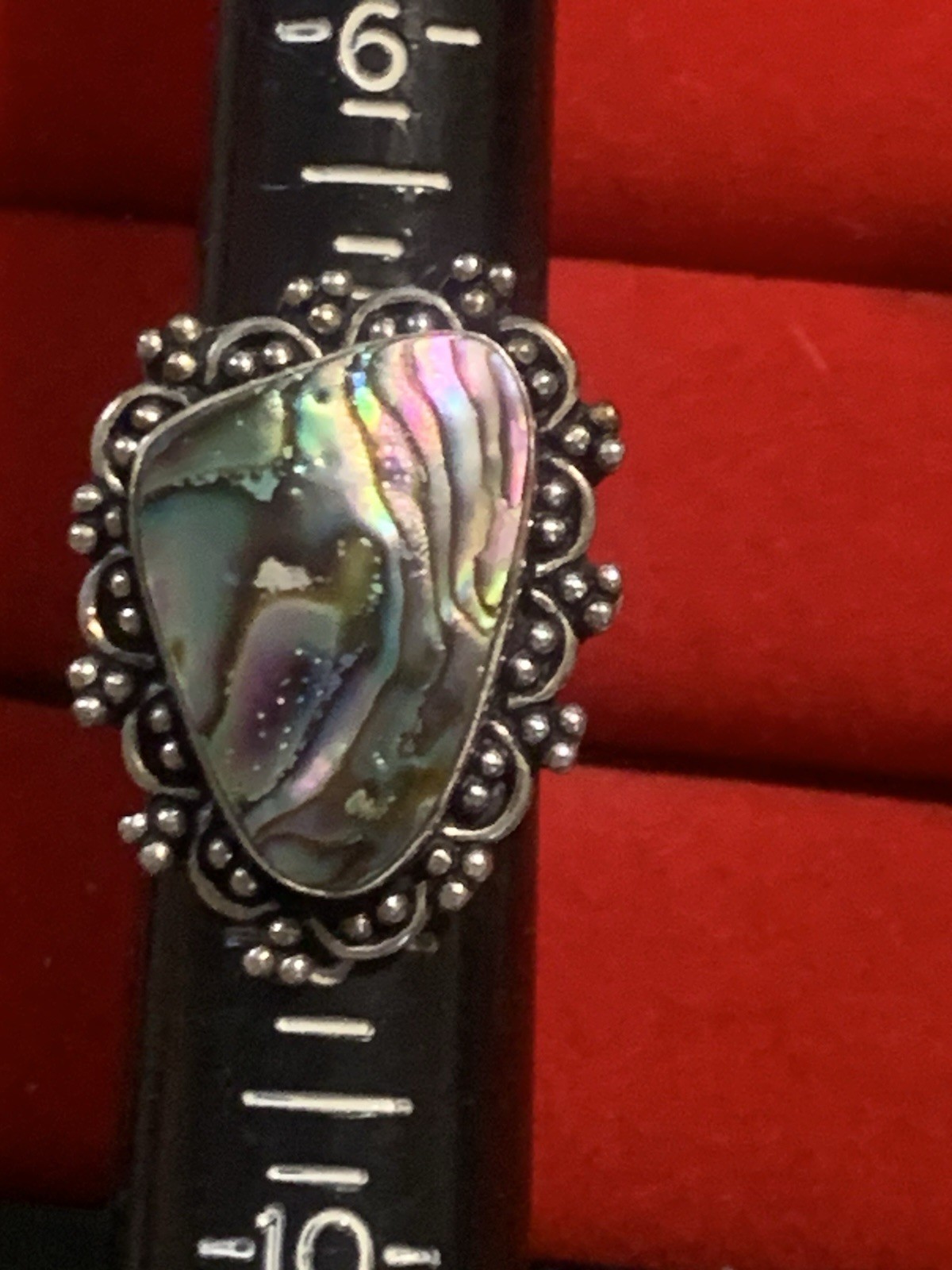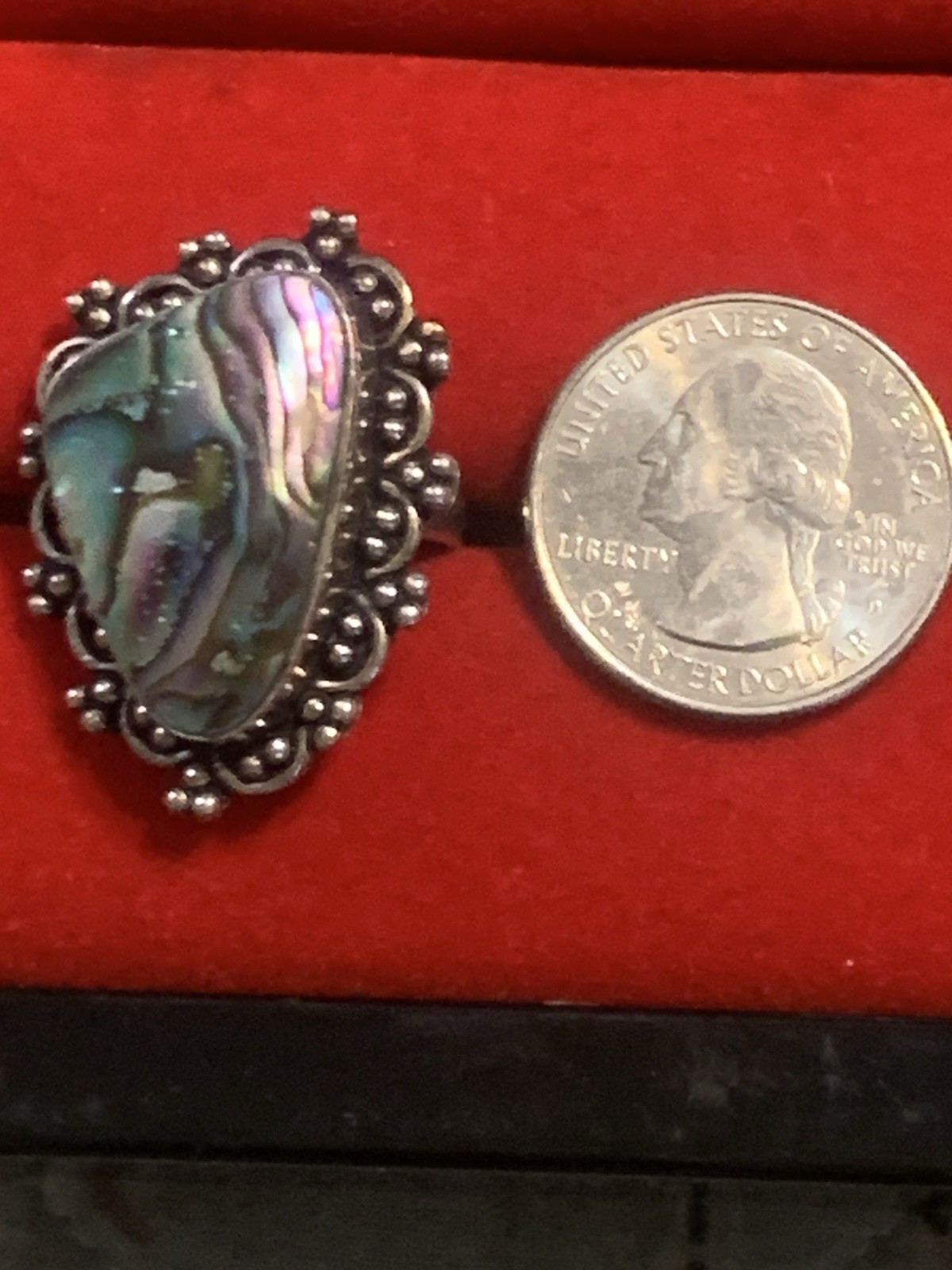 как выглядит Vintage Large STERLING SILVER ABALONE RING Marked 925 Stunning Colors Size 8.25 фото