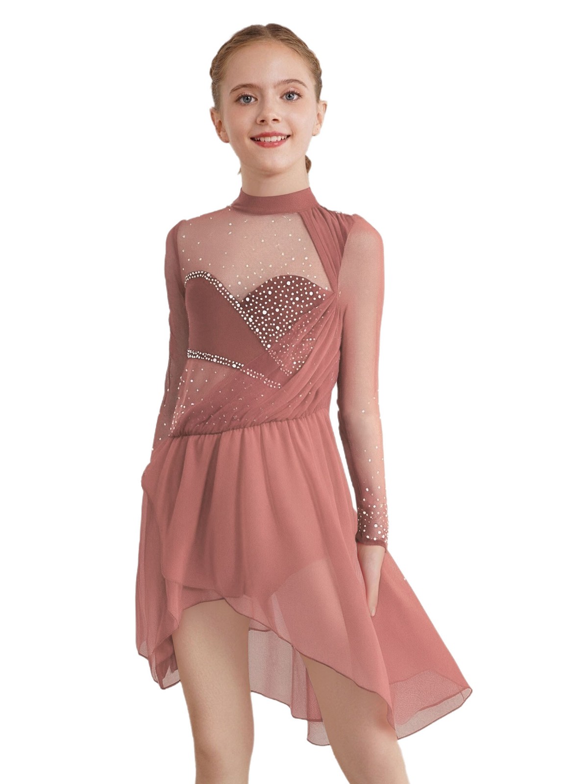Girls Figure Skating Shiny Rhinestone Mesh Ballet Leotard Lyrical Dance Dress