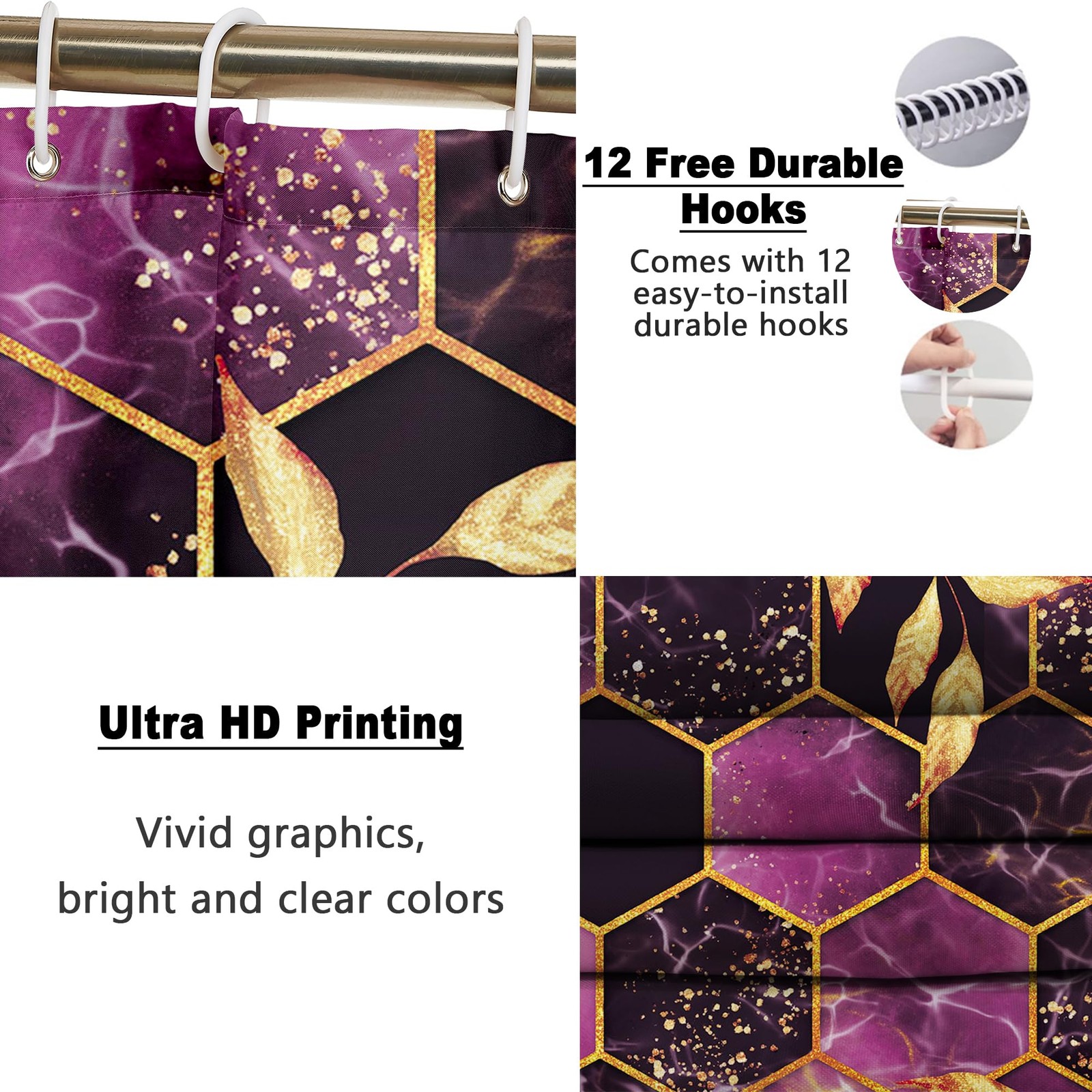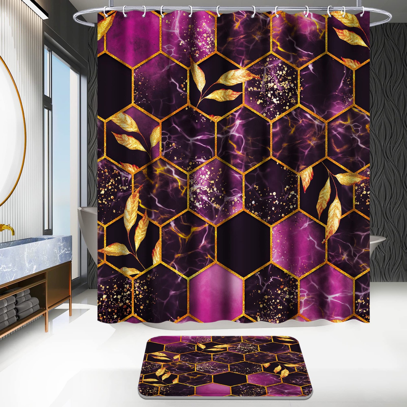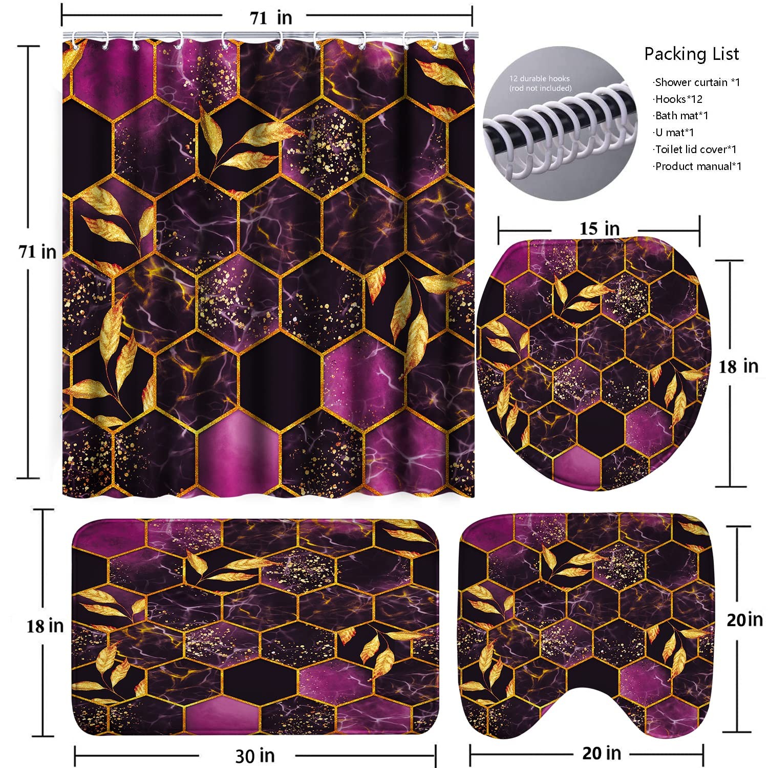 4 Pcs Bathroom Shower Curtain Set,Purple Honeycomb Marble Bathroom Sets with ...