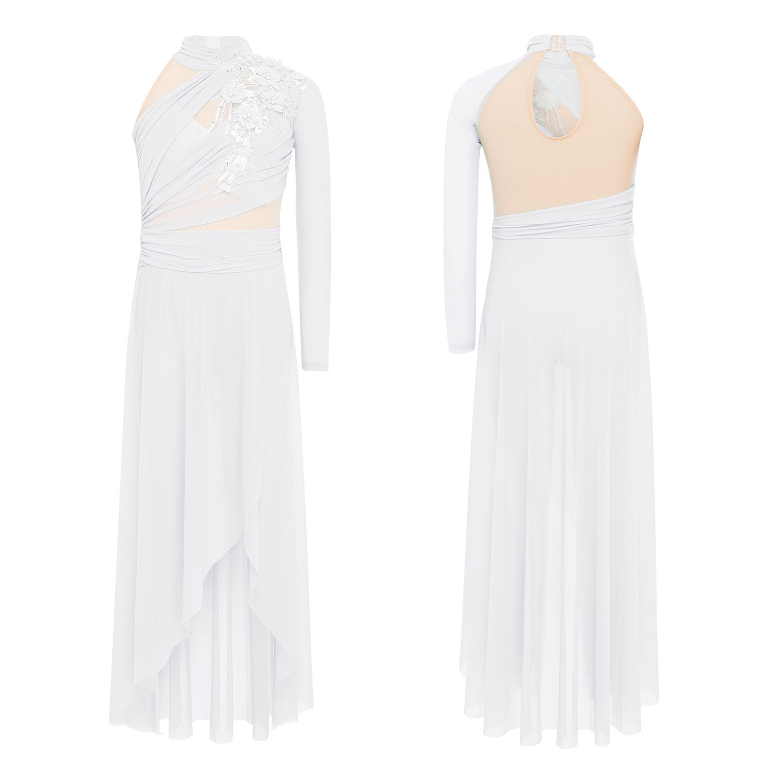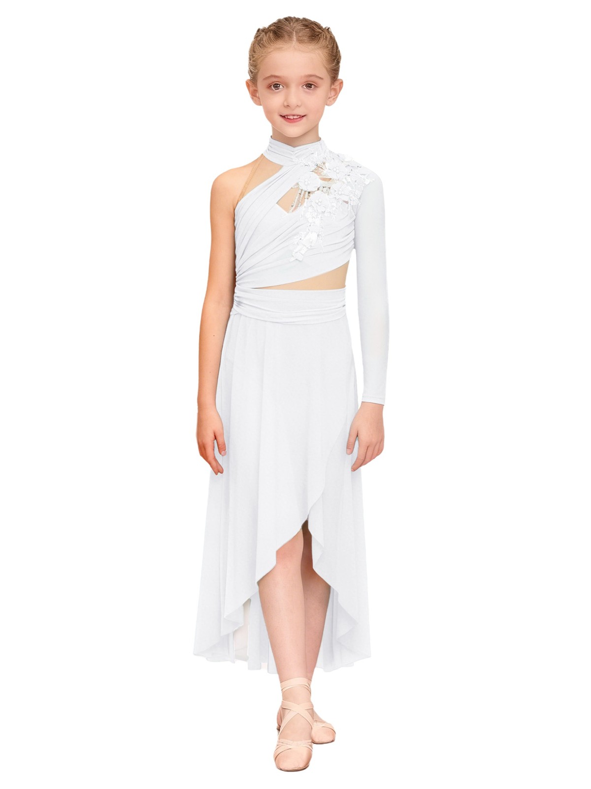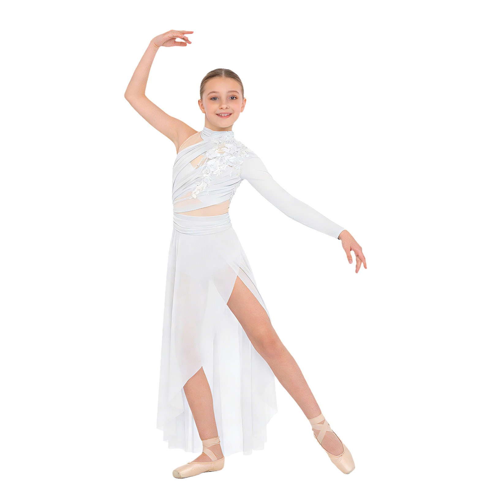 Kids Dance Dress Applique Ruched Ballet Leotard Contemporary High Low Mesh Skirt