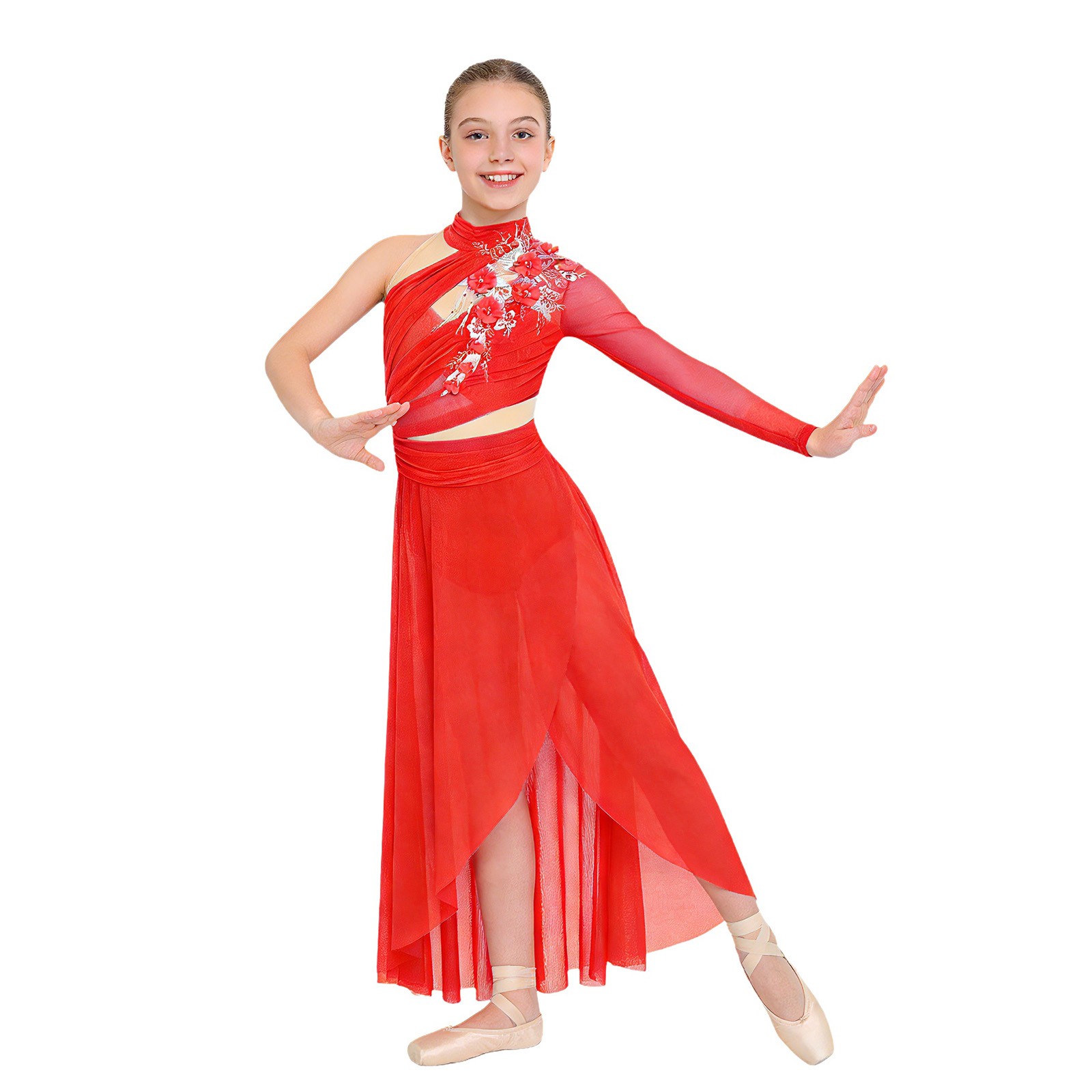 Kids Dance Dress Applique Ruched Ballet Leotard Contemporary High Low Mesh Skirt
