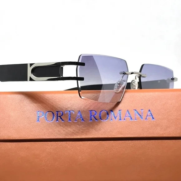 PORTA ROMANA FRAMELESS SUNGLASSES WITHBLUE LENSES WOOD TEMPLES