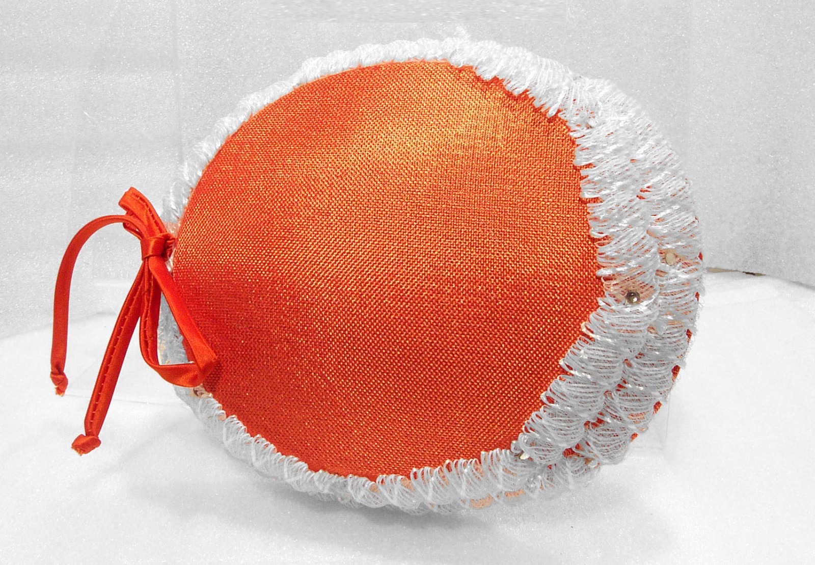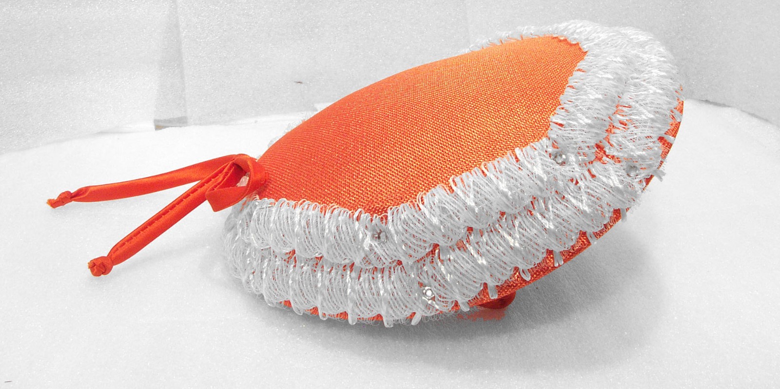 как выглядит Orange Hat /White Trim with Rhinestones Side Prongs Satin Tie Bow Vintage 50 s фото