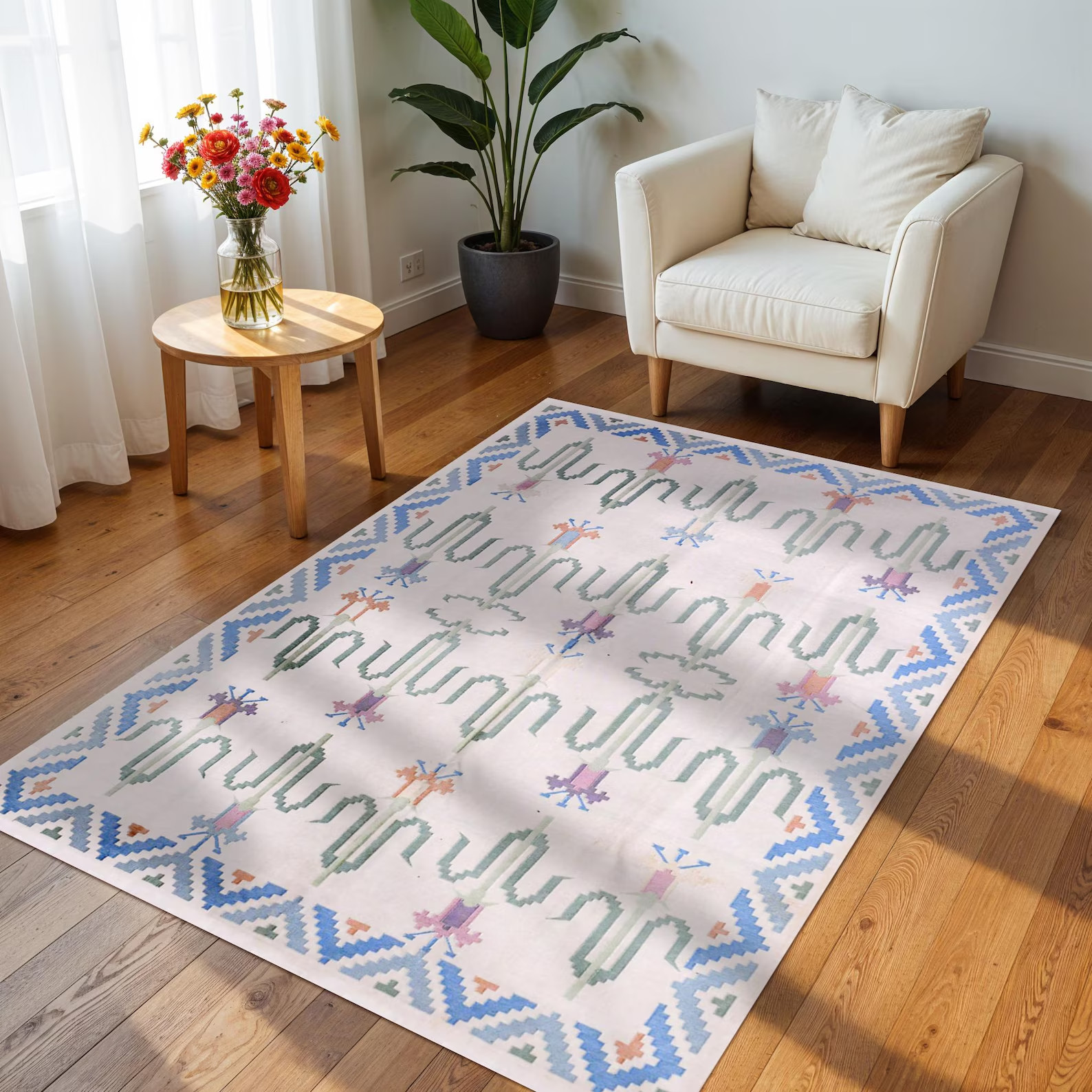 как выглядит Handwoven Cotton Dhurrie Kilim Rug Color Beige and Blue Design Carpet Rug фото
