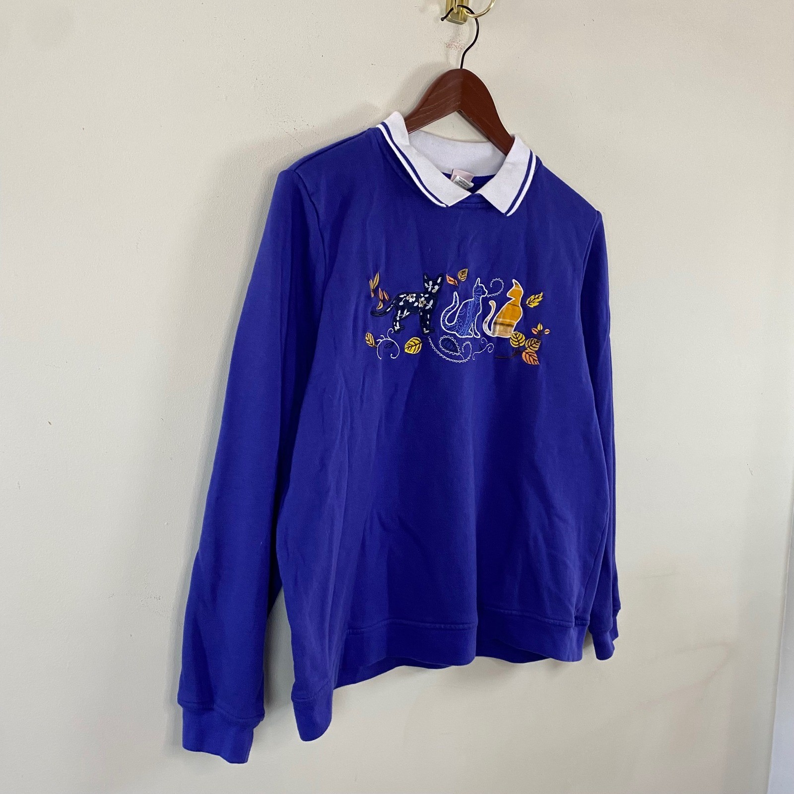 Vintage Embroidered Cat Collared Crewneck Sweatshirt Patchwork Grandmacore Large