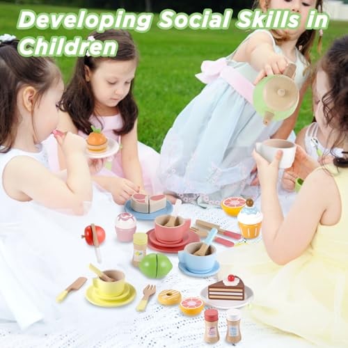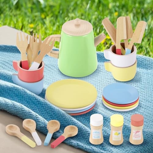 Wood Tea Set and Wooden Play Dishes 2 in 1 Play Color4 Tea Set Play Dishes