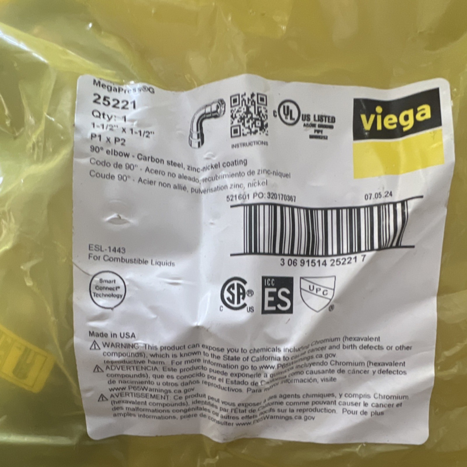 Viega MegaPress 90 Elbow 1-1/2 in Carbon Steel Zinc-Nickel Smart Connect 25221