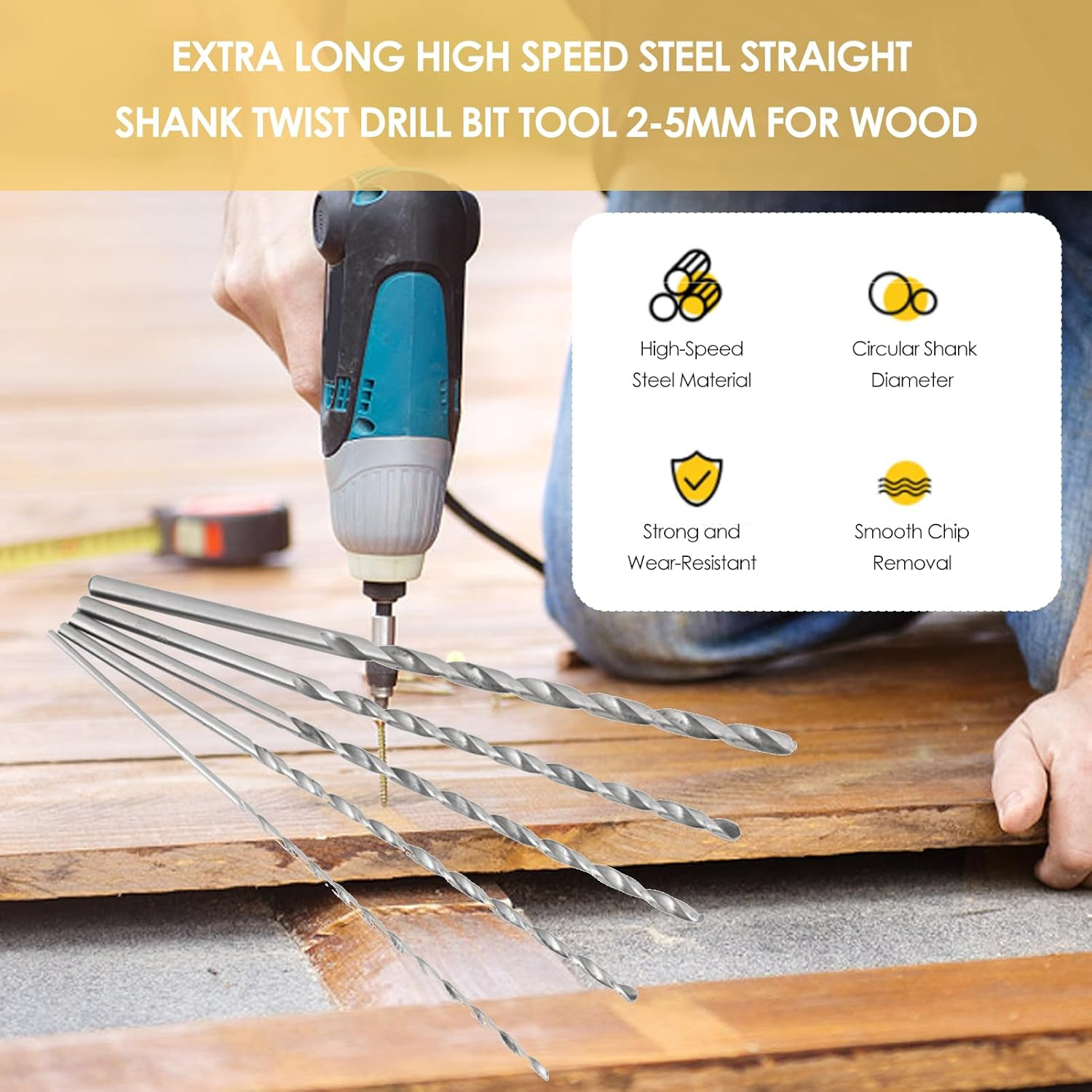 5PCS Extra Long High Speed Steel Drill Bit Sets Straight Shank Drill Bit Tool Wo