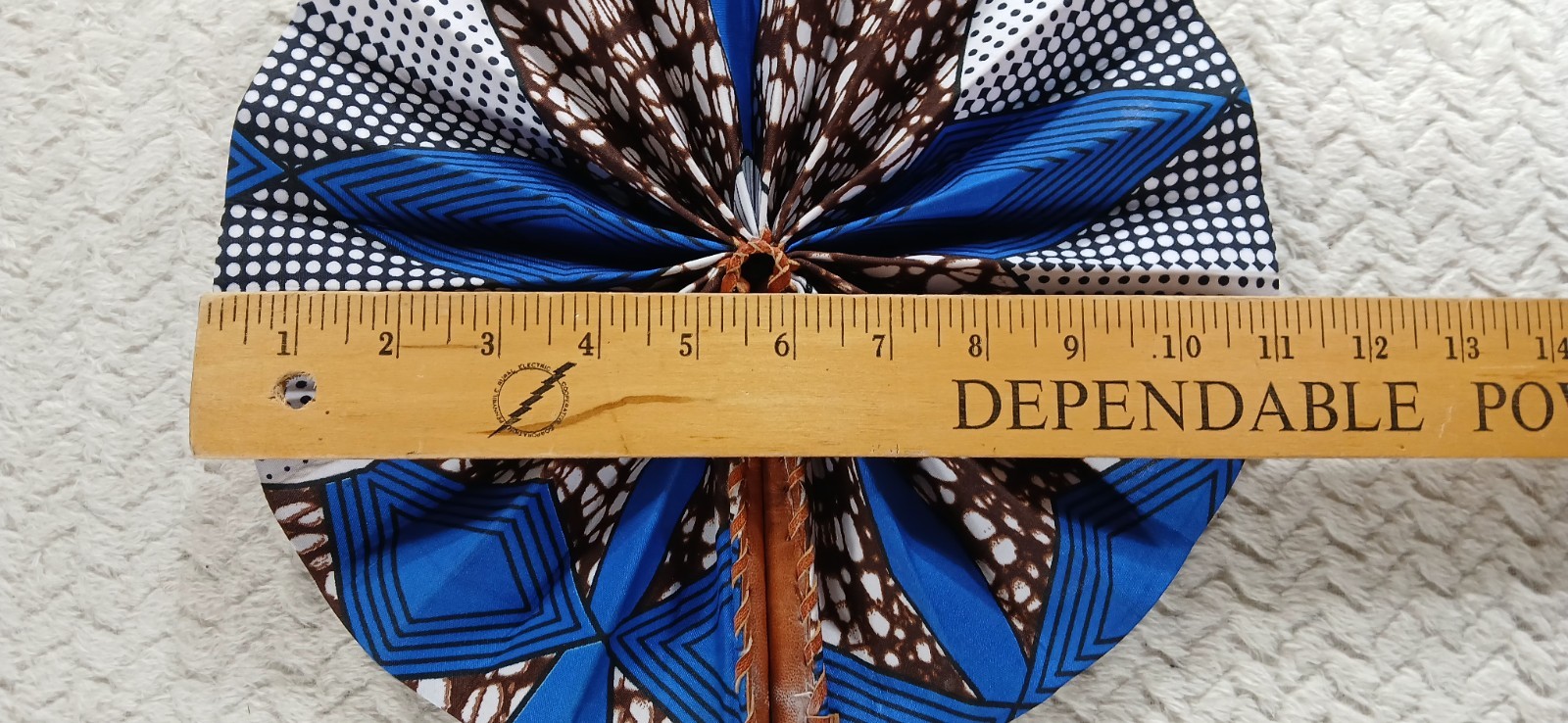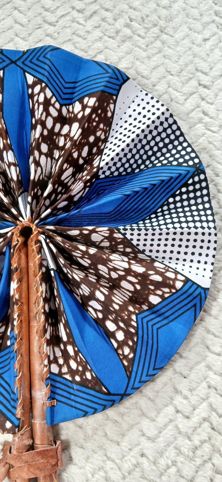 как выглядит West African NEW Ankara Blue White Black Cloth and Leather Fans 11" Diameter фото