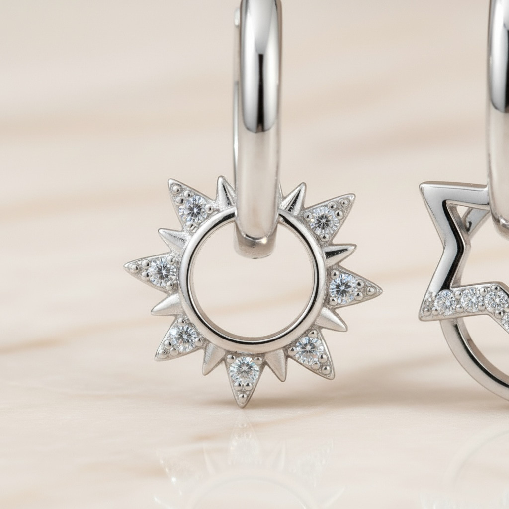 как выглядит Gold Star Earrings  Celestial Huggie Star Hoops with CZ, Starburst Sun Charm фото