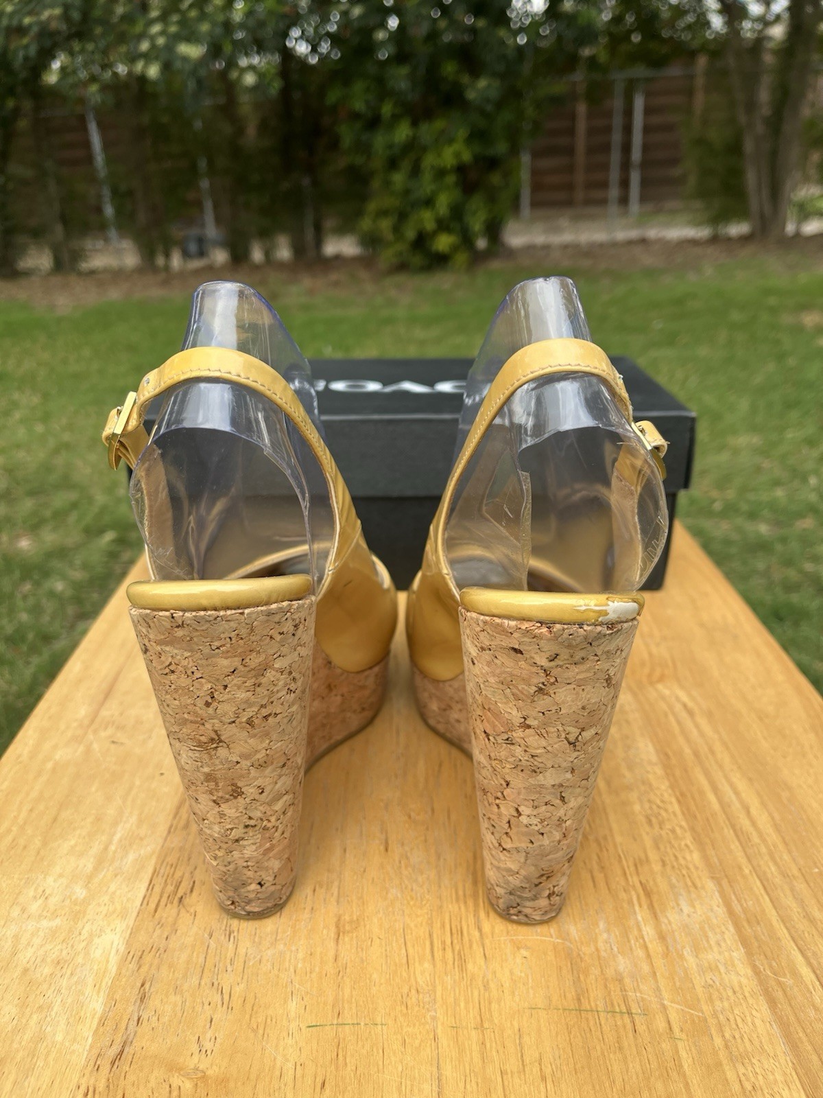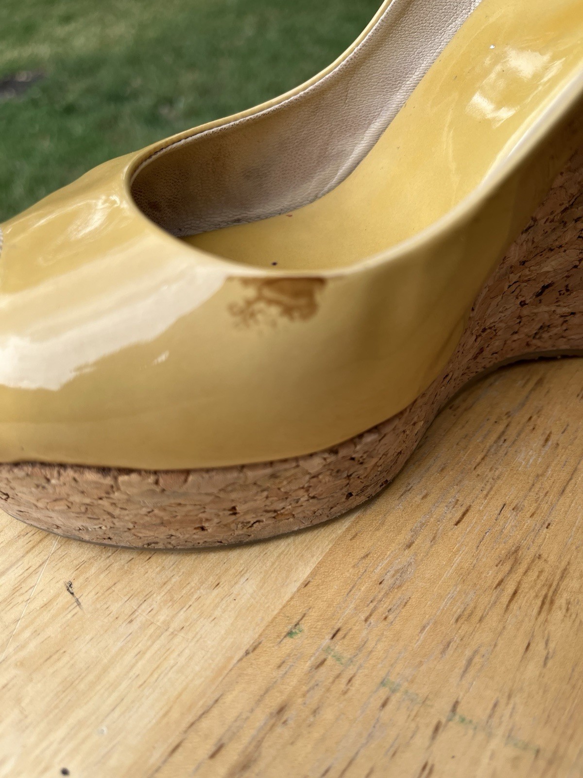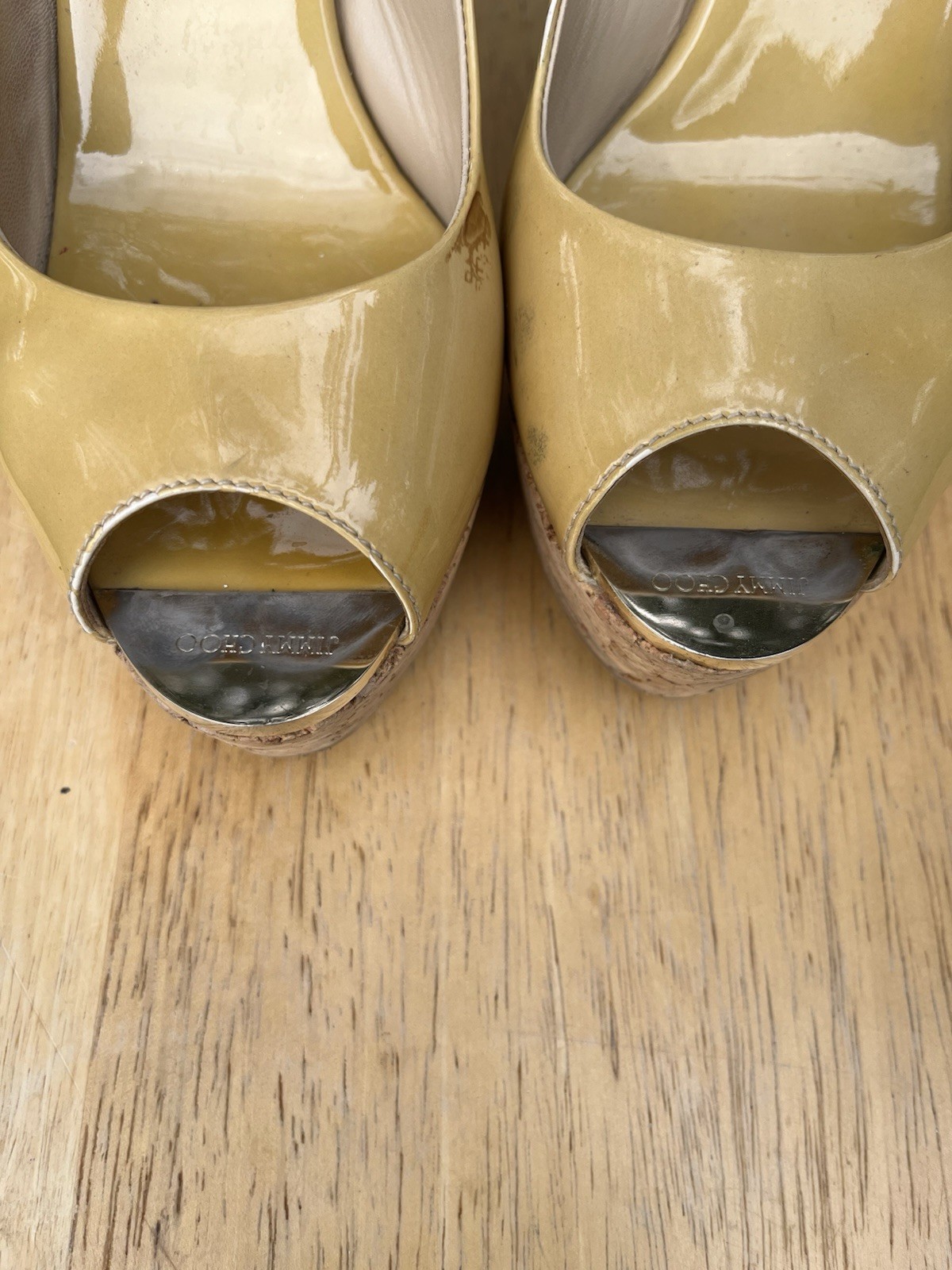 как выглядит Jimmy Choo Peach Patent Leather Slingback PeepToe Platform Cork Wedge 37.5 фото