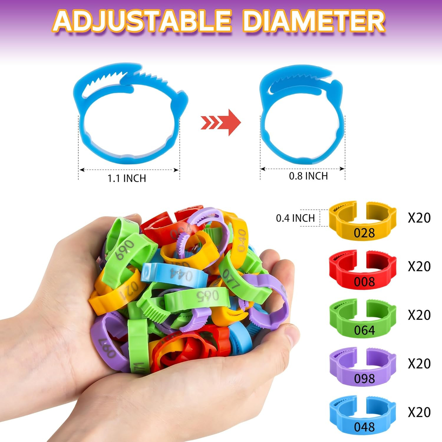 100Pcs Chicken Leg Bands, 14-22Mm Adjustable Poultry Tags, Durable Multi-Colored