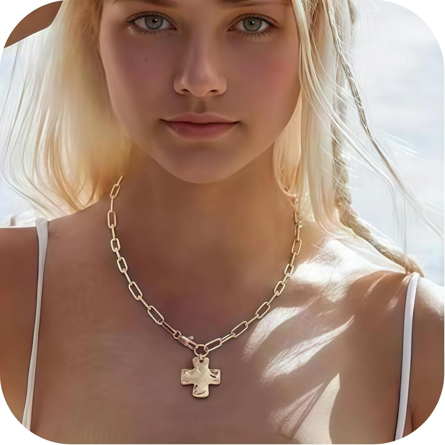 Chunky Cross Necklace for Women, Gold and Silver Alloy Vintage Paperclip Chain,