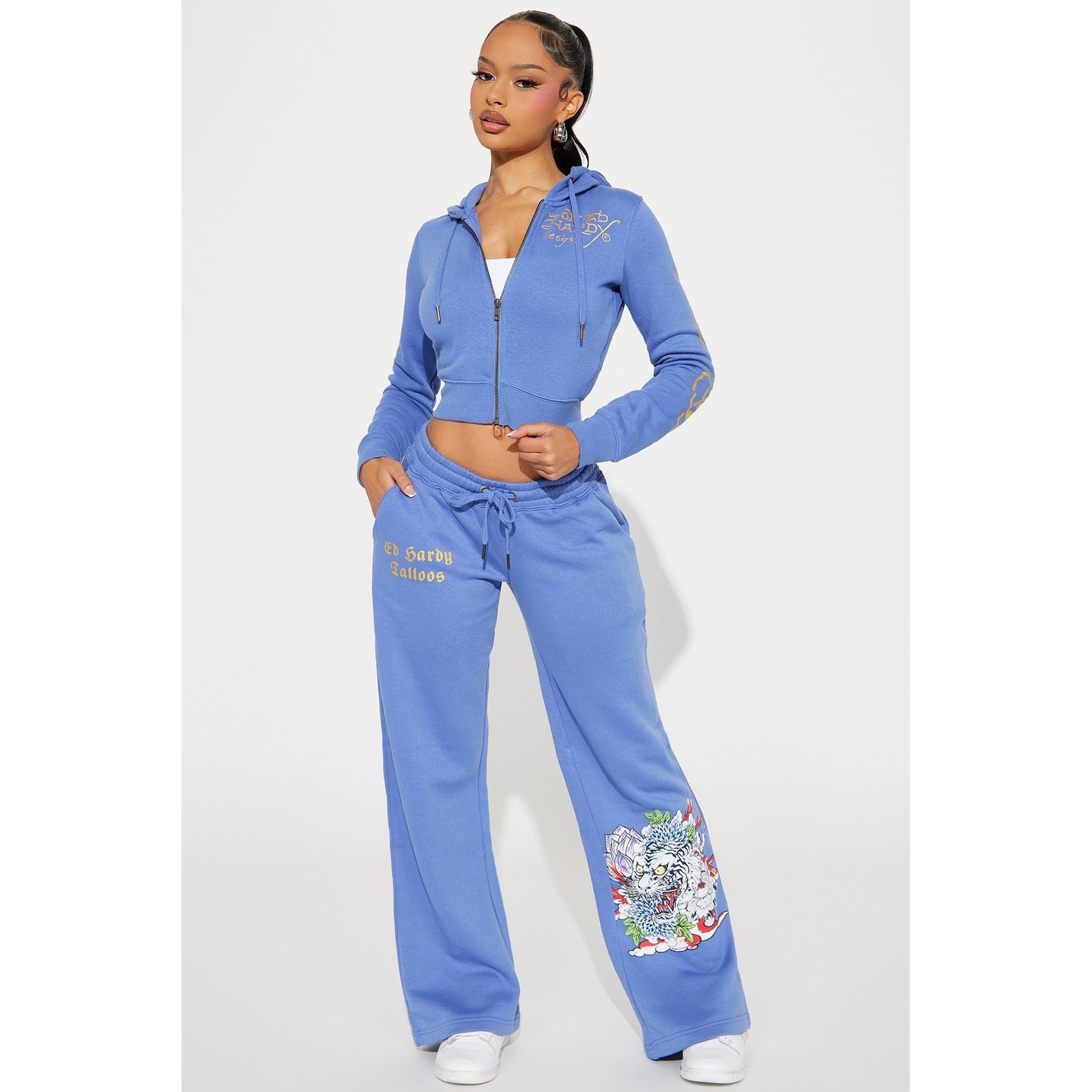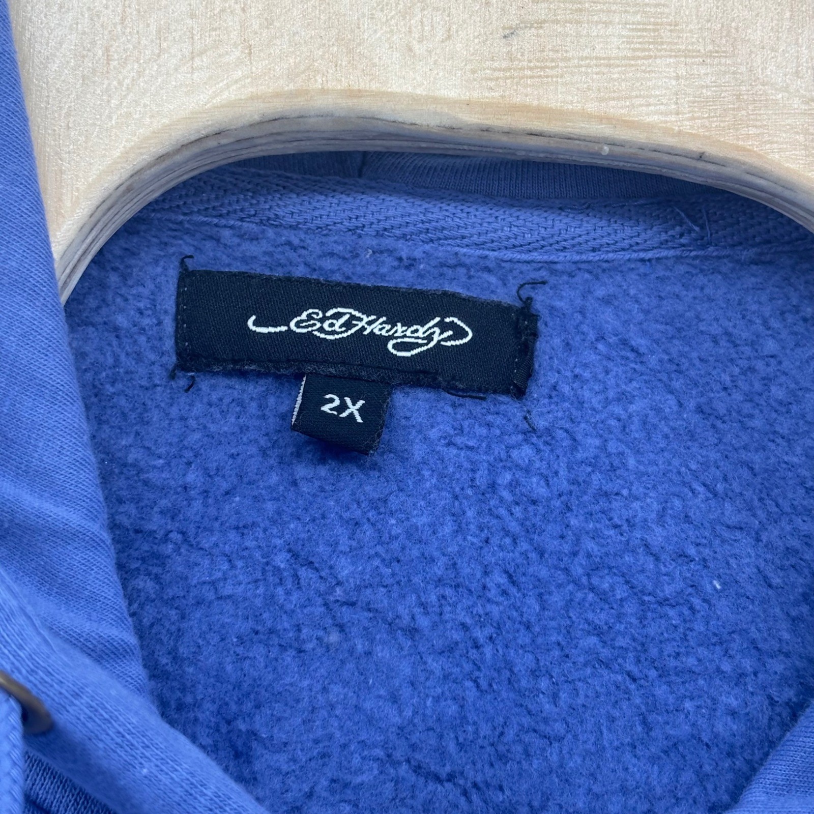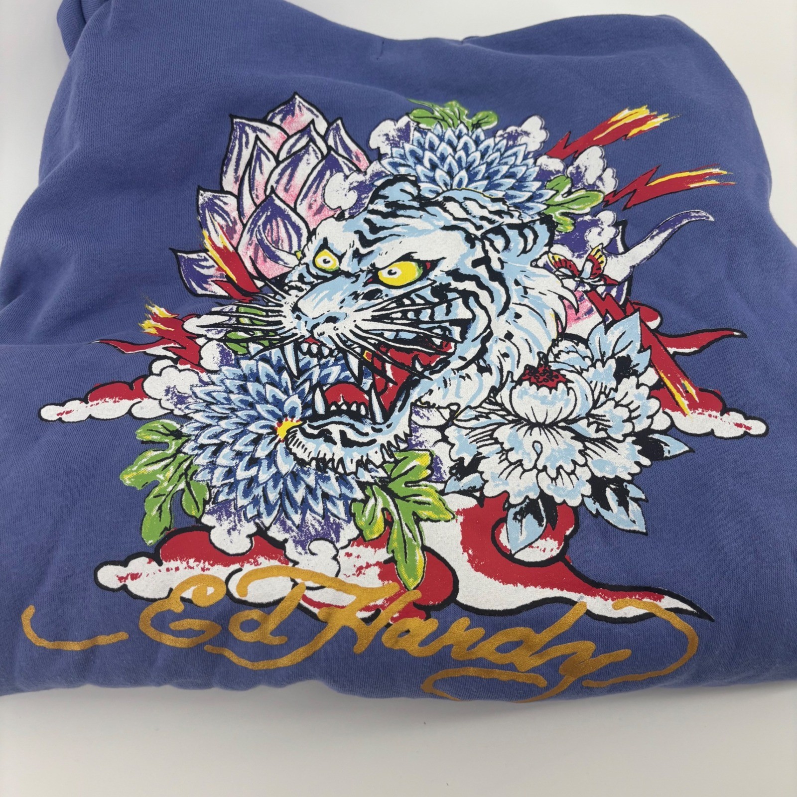 Ed Hardy Zip Up Hoodie Blue Womens 2X Cropped White Tiger Lotus Graphic